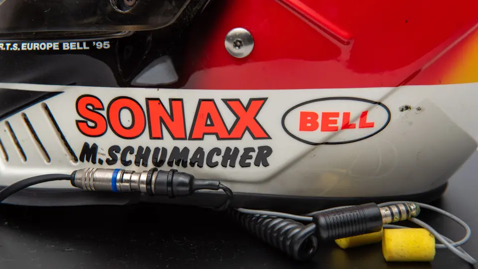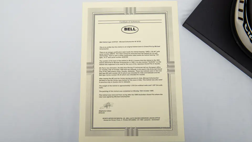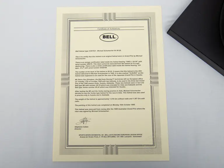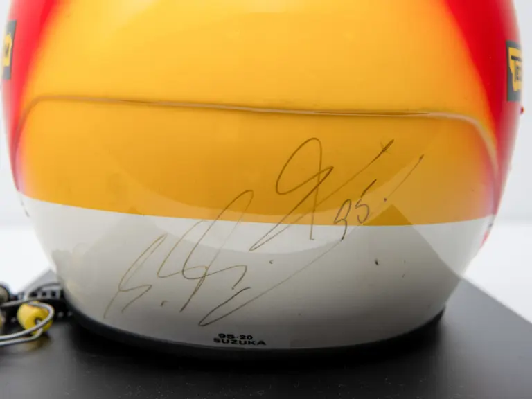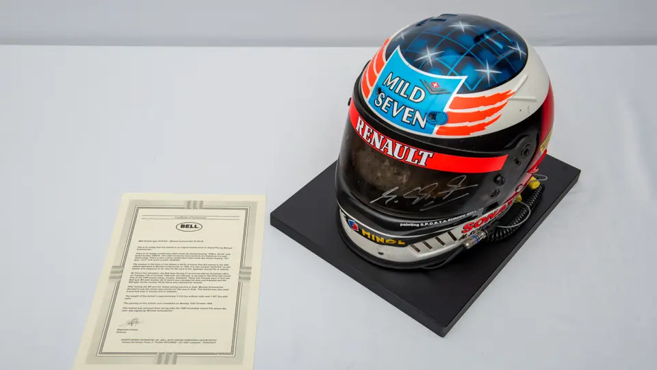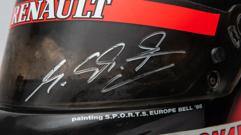 Confirmed by a Bell Certificate of Authenticity, this helmet was worn by Michael Schumacher when he raced for Benetton in the 1995 Japanese Grand Prix weekend. It is signed by Michael Schumacher. Qualifying in pole position, Schumacher set the fastest lap and finished first. As a result of Schumacher's victory, Benetton claimed the Constructors Championship Title for 1995. Schumacher was also Formula 1 World Champion that year.