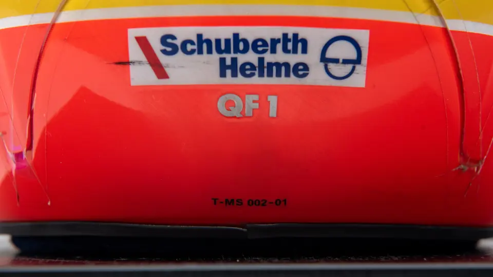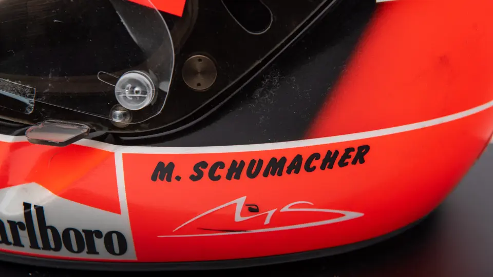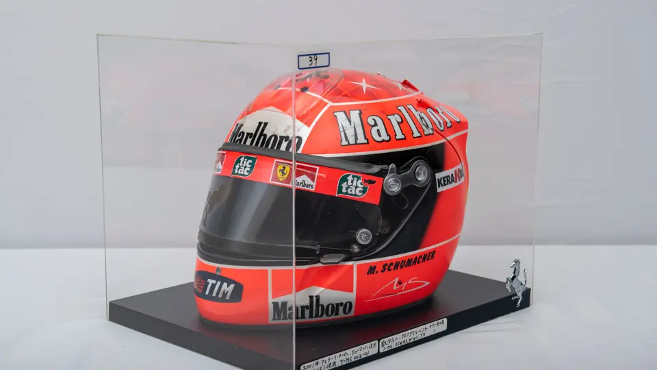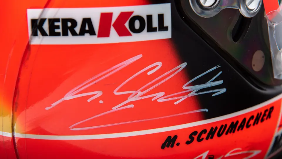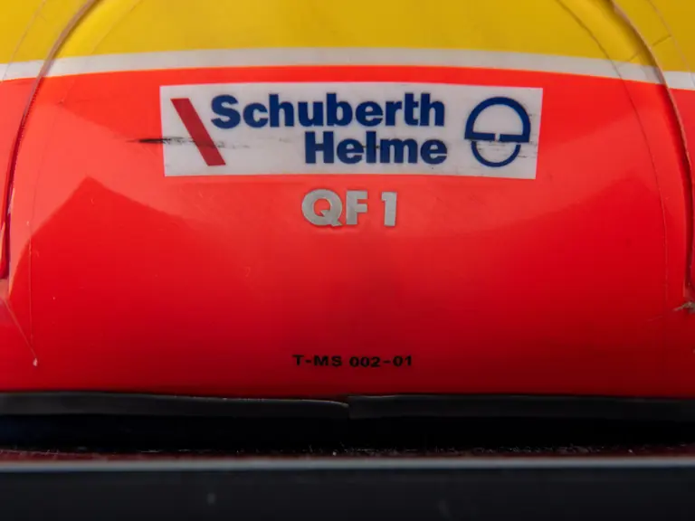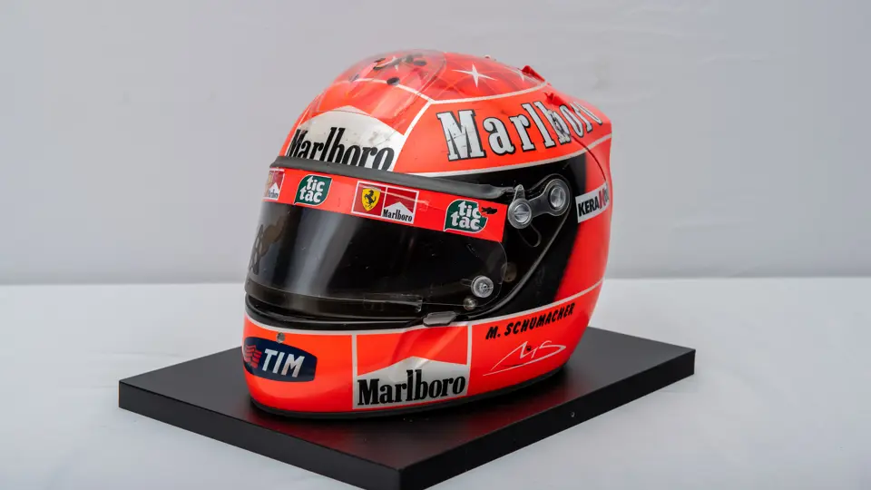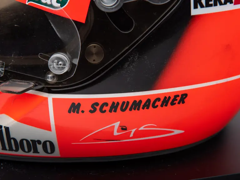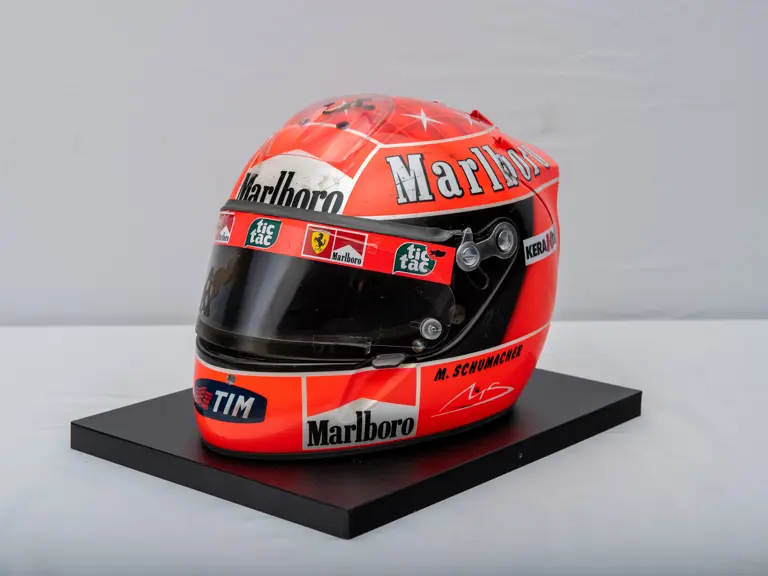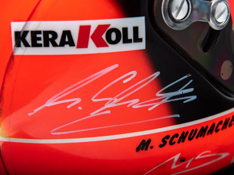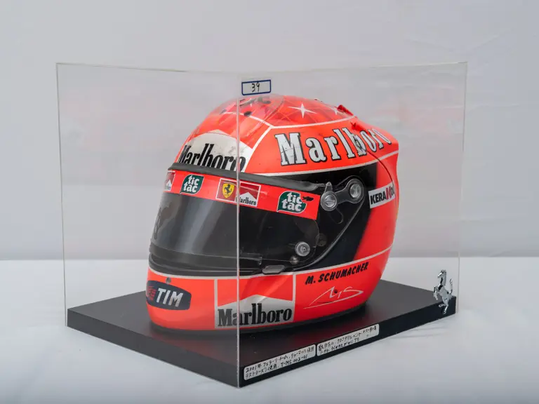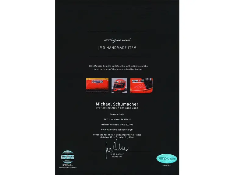 Certified by Jens Munser Designs as an authentic example. Produced for Ferrari Racing Days that took place from 29 September to 1 October 2001. This helmet was a pre-test item and not race used, and is signed.