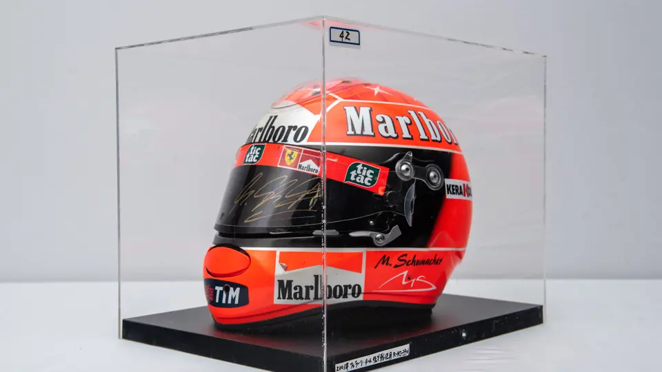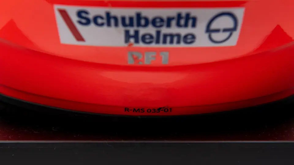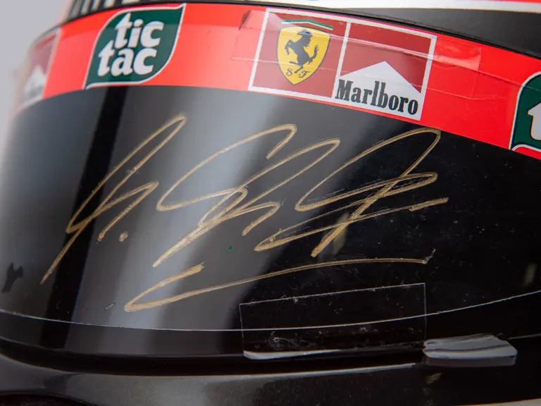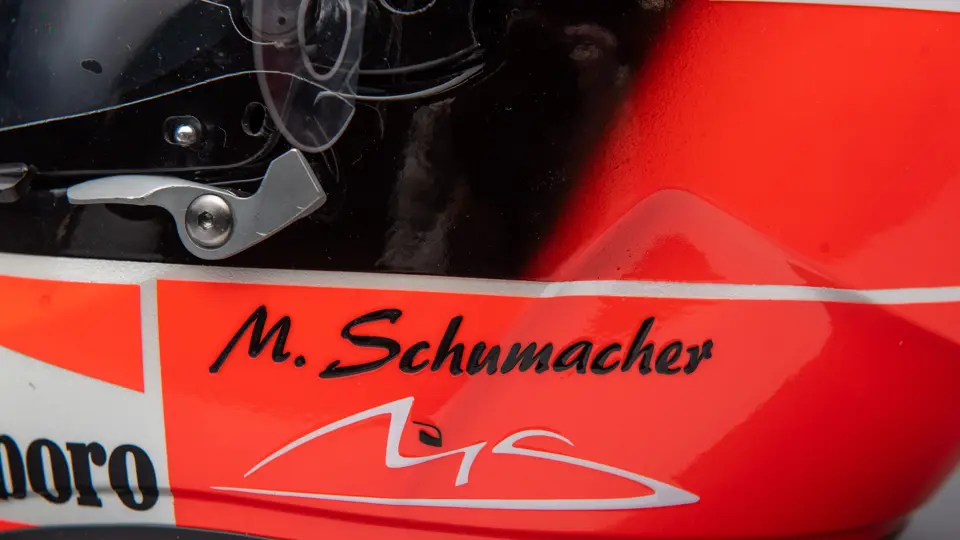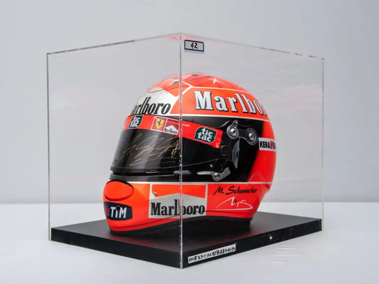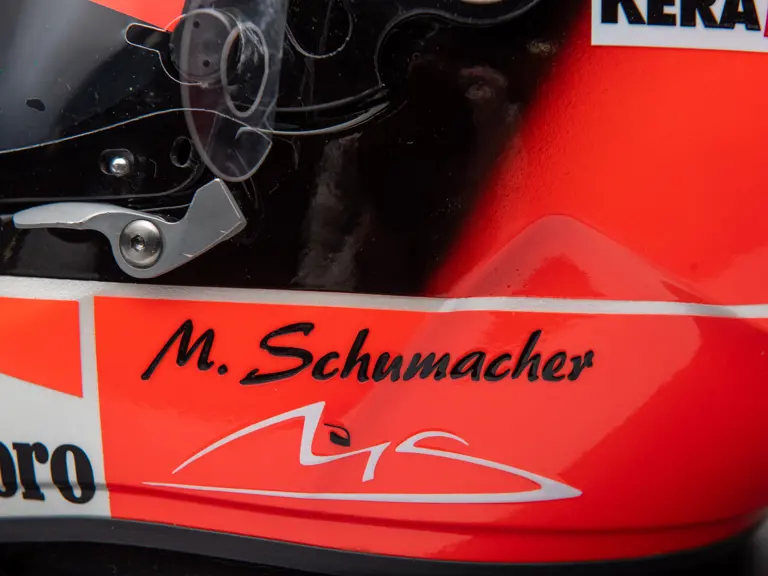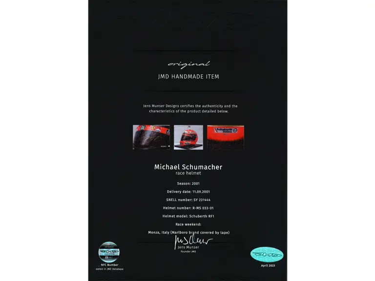 Certified by Jens Munser Designs as an authentic example. This helmet comes from Michael Schumacher's Championship Winning Year in 2001. Delivered on 11 September 2001, this helemt was used by Michael Schumacher at the Italian Grand Prix in Monza. He qualified 3rd, and finsihed in 4th place. The visor is signed.