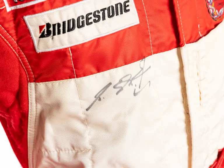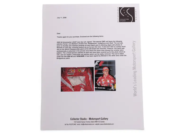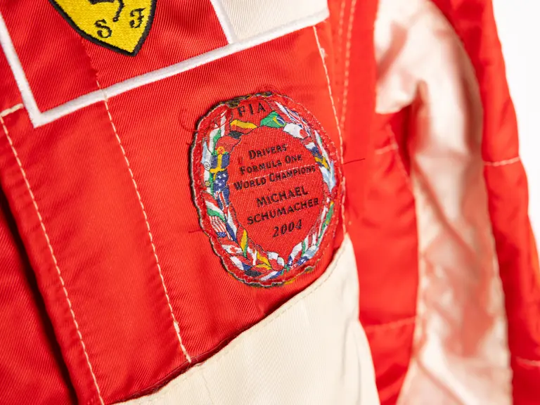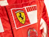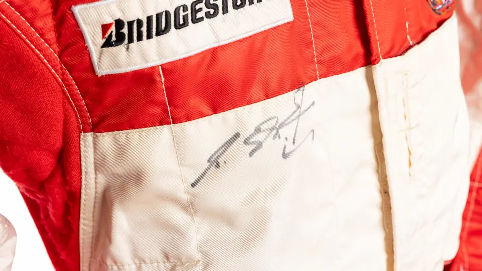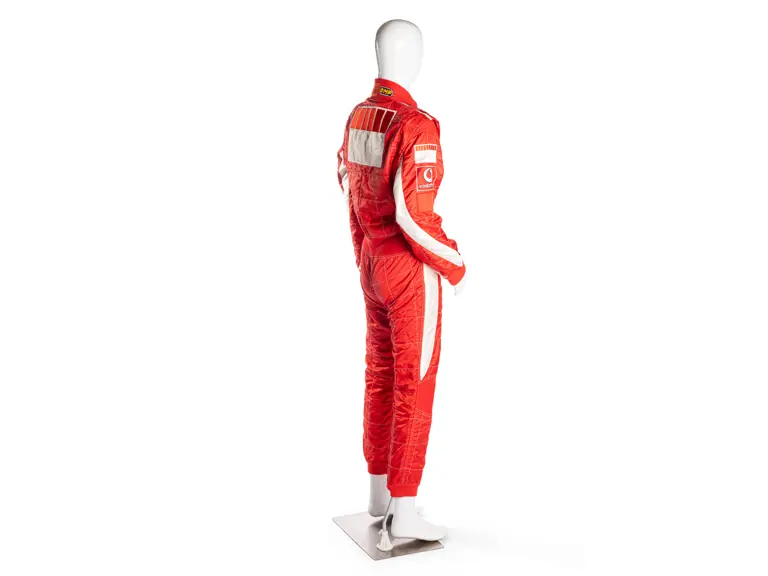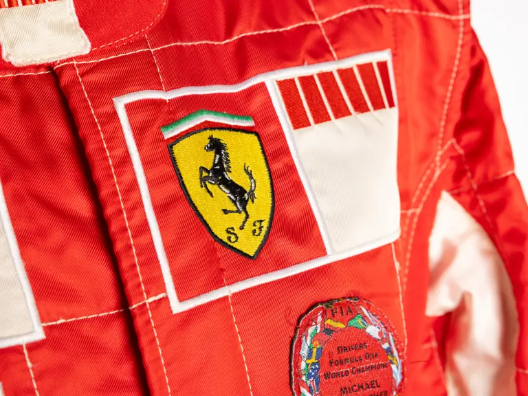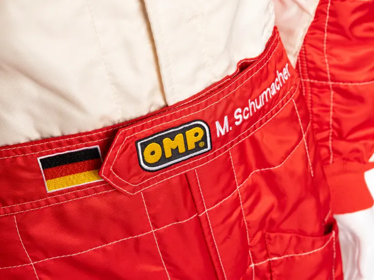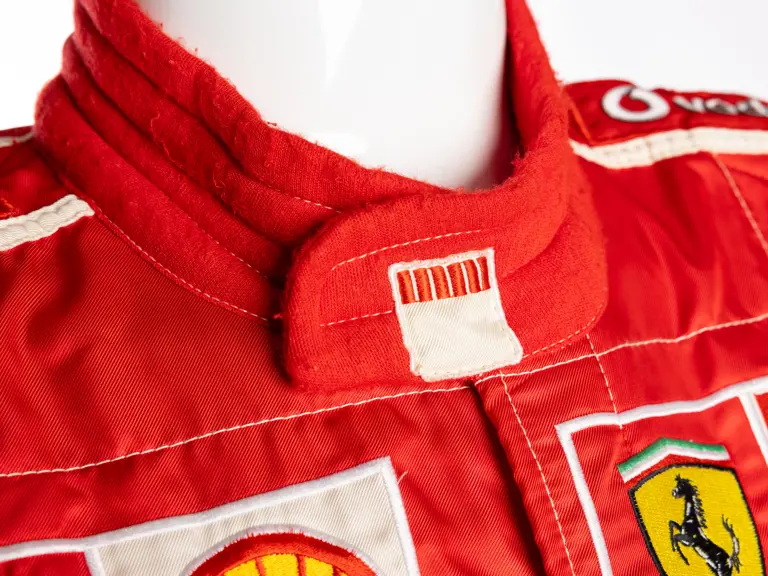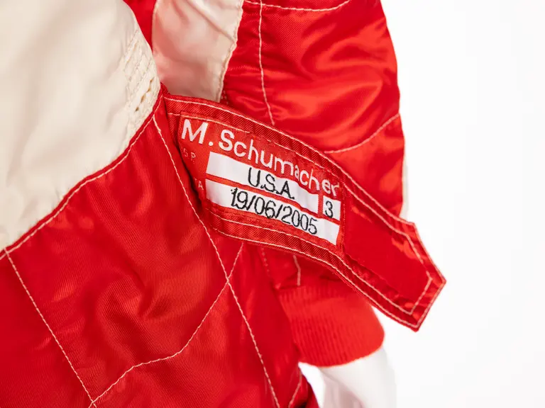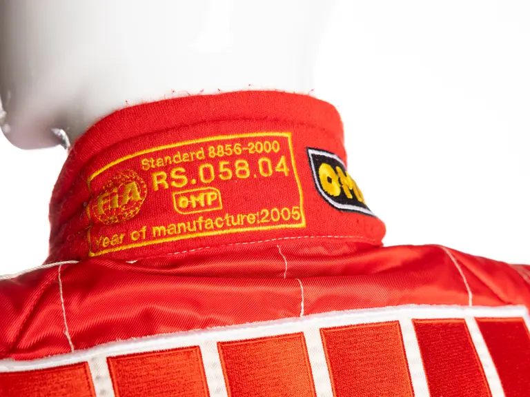 This Scuderia Ferrari OMP race suit was used during the infamous 2005 United States Grand Prix. Schumacher qualified 5th and finished 1st overall, setting the fastest lap in the race. This was Schumacher's only winning race in 2005, where he came 3rd in the Driver's Championship.