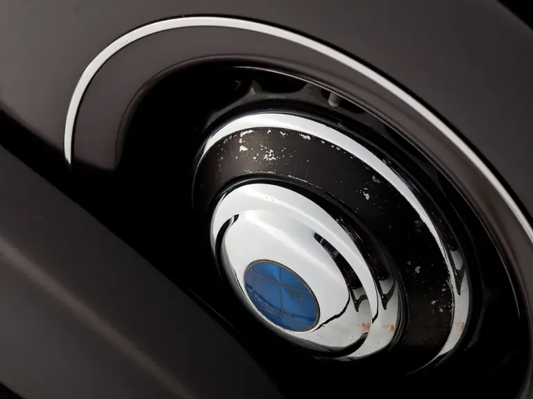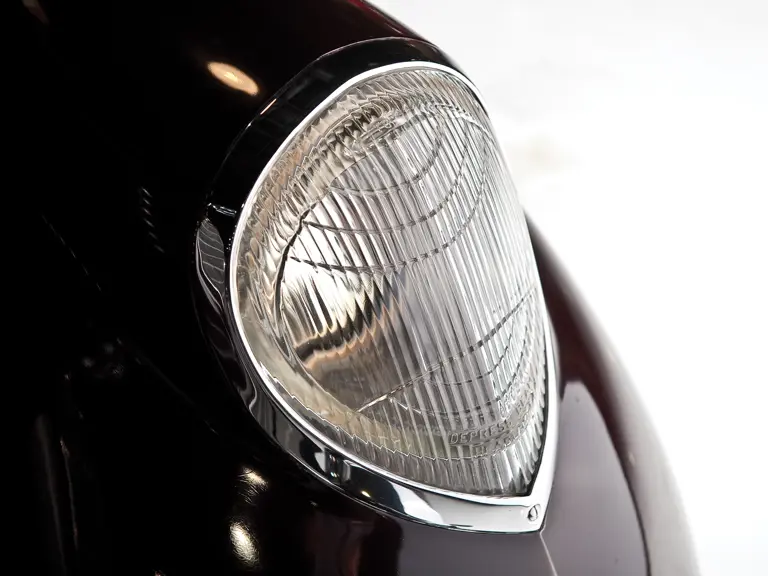 In amazing original condition, the car wears its Royal Maroon livery well. The car has been maintained, not restored, so changes have been limited to touch-up in high-stress areas. It has a tan canvas top, twin side-mount spares, color-matched wheels and Trippe driving lights.