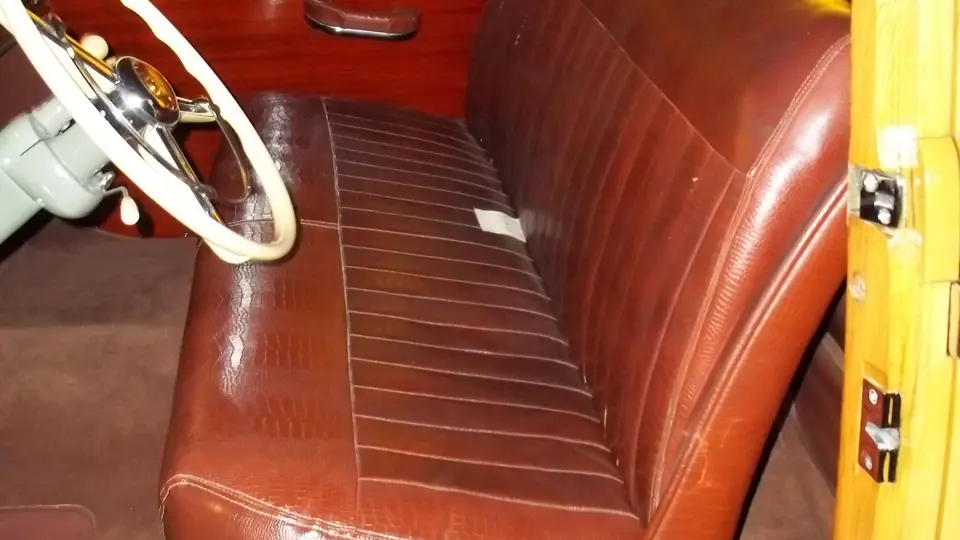 Finished in Fog Green, the car retains its original brown “Toltec” imitation alligator-hide interior upholstery, which remains remarkably well preserved and presentable, notwithstanding some age-appropriate wear, which the current owner elected to leave undisturbed. The dashboard and steering wheel are highlighted by “xylonite,” an amber-colored plastic that subtly complements the “Toltec” upholstery.