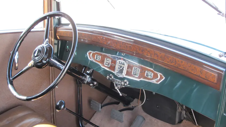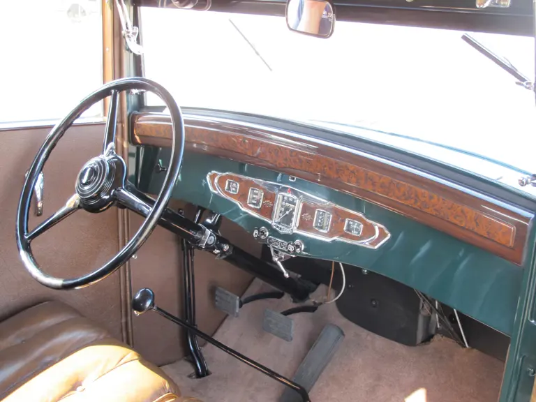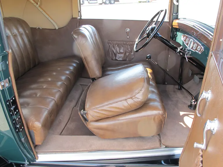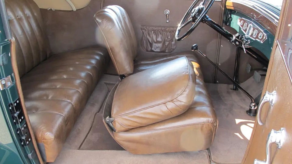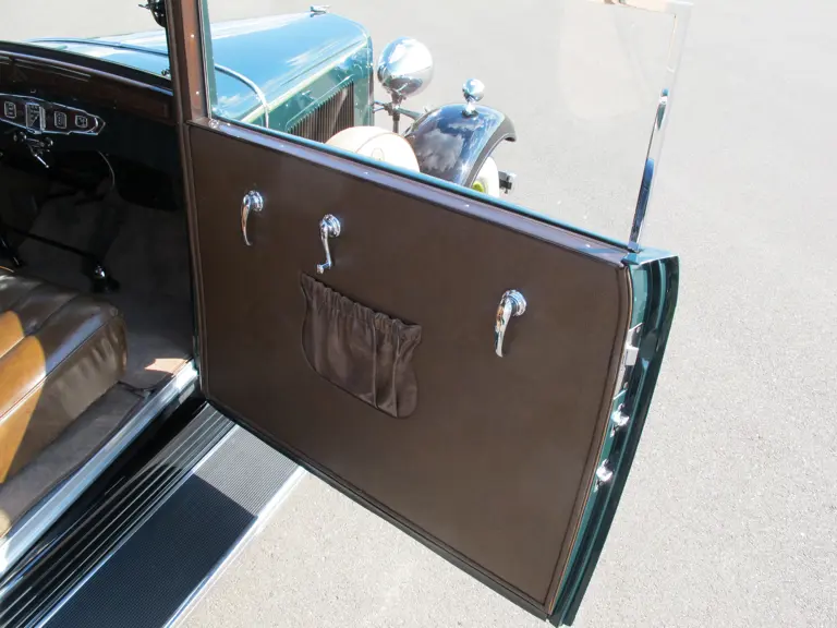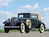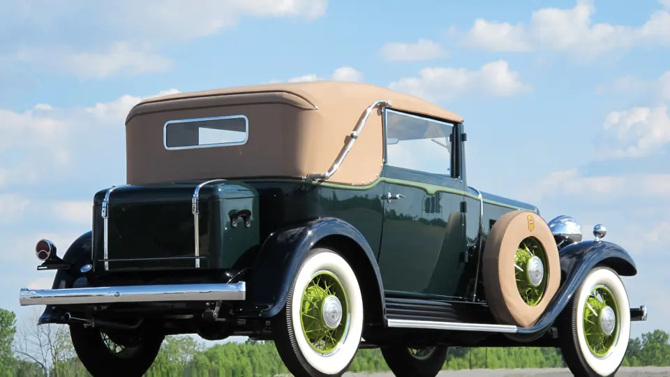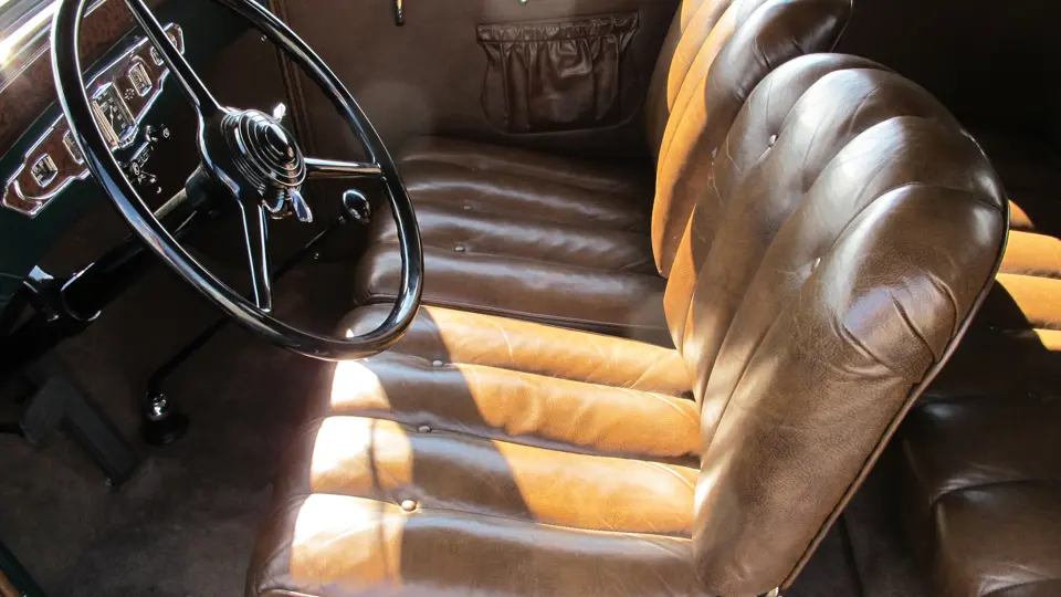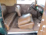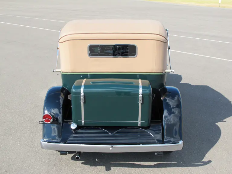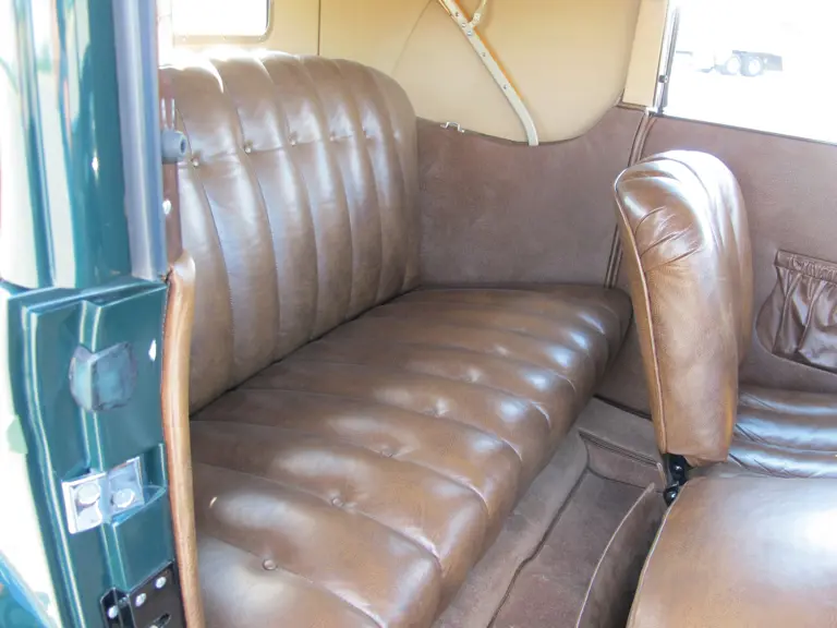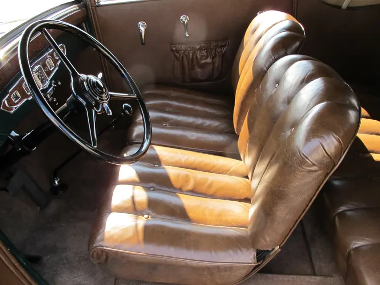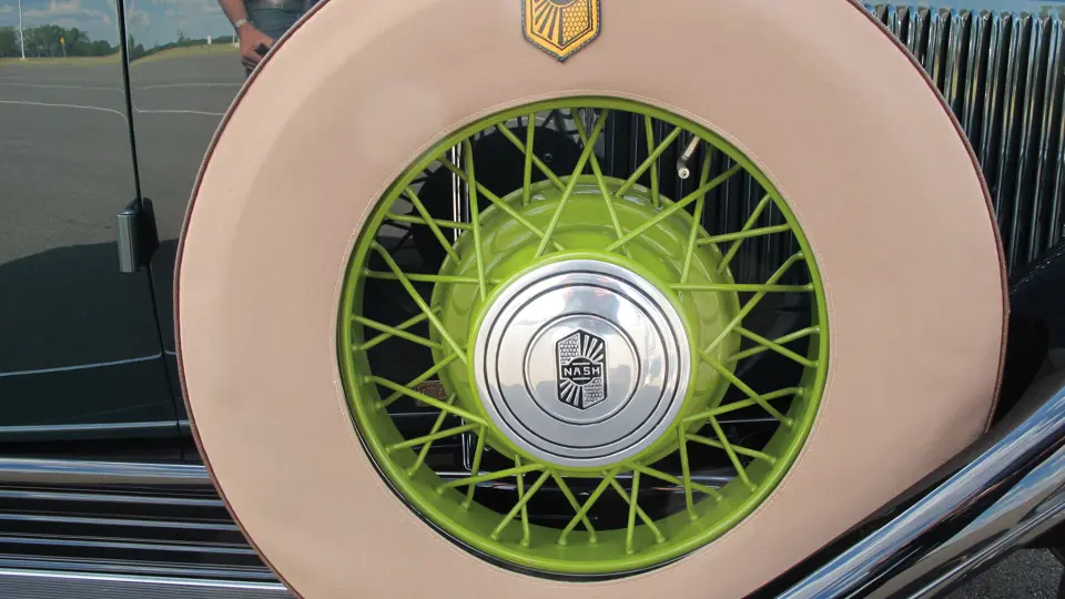 The Nash was known for outstanding performance, quality materials, and solid assembly, and this example is no exception. It has been restored in the attractive combination of Dark Green with Black fenders complemented by pale green accents and coachlining, along with whitewall tires on Apple Green wheels. A brown leather interior and tan cloth Victoria roof complete the ensemble. Dual side-mount spare tires are fitted with matching tan cloth covers emblazoned with the Nash emblem, just like those on the wire wheel centers. In addition, the car is fitted with a body-colored accessory trunk. The car shows little use and good care since its restoration. Thanks to limited production and the likelihood of few survivors, this car will certainly be the hit of local shows and events.