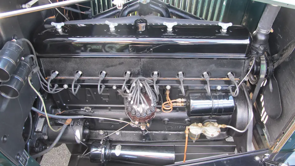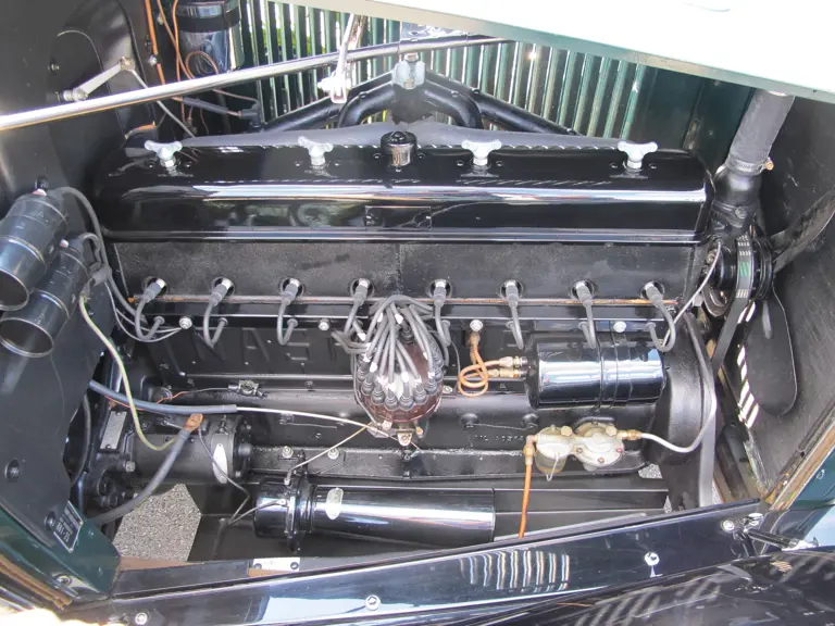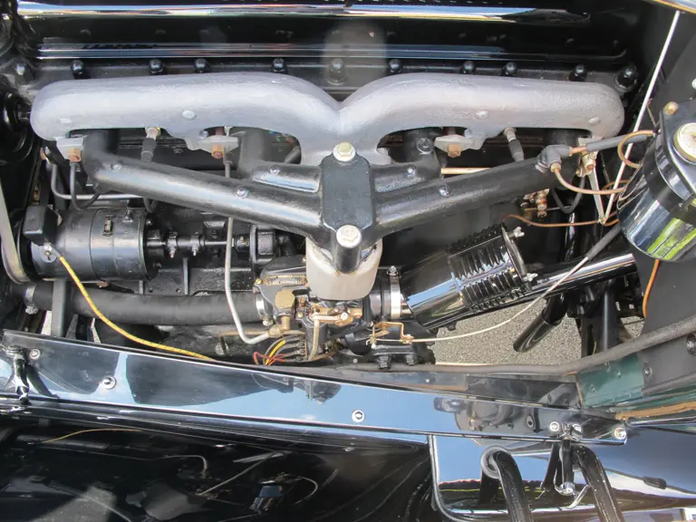 94 hp, 240 cu. in. twin-ignition OHV straight eight engine, three-speed sliding gear transmission, semi-floating rear axle with semi-elliptic leaf springs in the front and rear, and four-wheel mechanical drum brakes. Wheelbase: 121"