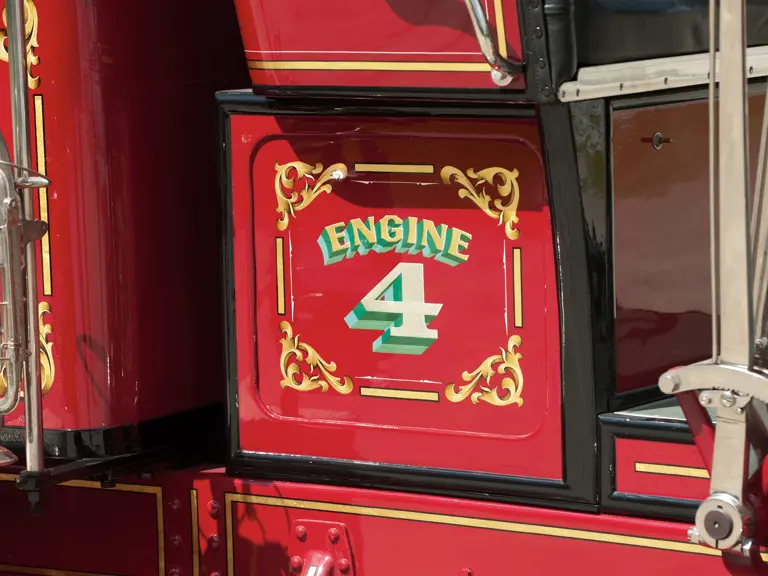 Mr. Ruger once again commissioned fire apparatus experts Andy Swift, of Firefly Restorations in Hope, Maine, and gold leaf artist Peter Achorn, of FireGold in Tenants Harbor, Maine, to perform a thorough, concours quality restoration on both the mechanicals and cosmetic aspects of this truck. The restoration effort was concluded over a period of four years and like the other Ahrens-Fox offered from the Ruger Collection, the result is concours presentation of all aspects of this truck, from the sheet metal, paint, and intricate gold leaf to the leather upholstery and finish on the flawlessly varnished wooden dash.
