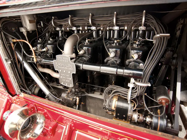 Mr. Ruger acquired this Model P-S-14 hose truck in 2005, with only 2,500 original miles. According to Ahrens-Fox model nomenclature, the first letter in the model designation conveys the engine type, with the “P” denoting Ahrens’ largest six-cylinder offering, which has a bore of 5-7/8 inches and a 7-inch stroke. The “S” conveys locomotion aided by shaft drive as opposed to chain drive, which wasn’t found on very many Ahrens-Foxes, or motor cars in general for that matter, after 1920, and the number “14” identifies the body as a hose wagon.
