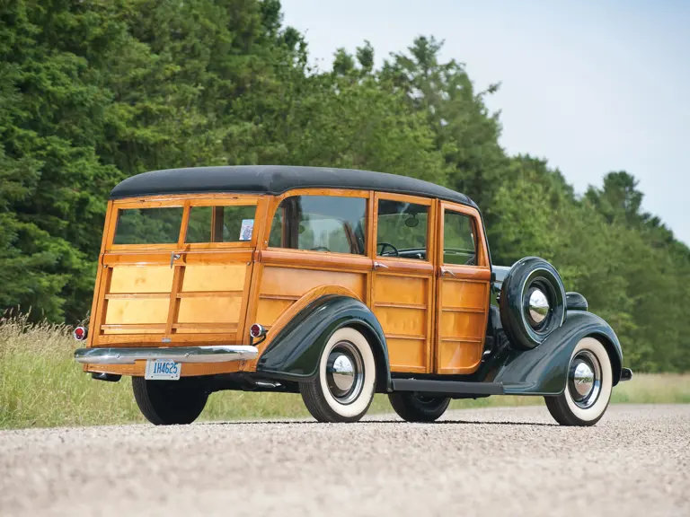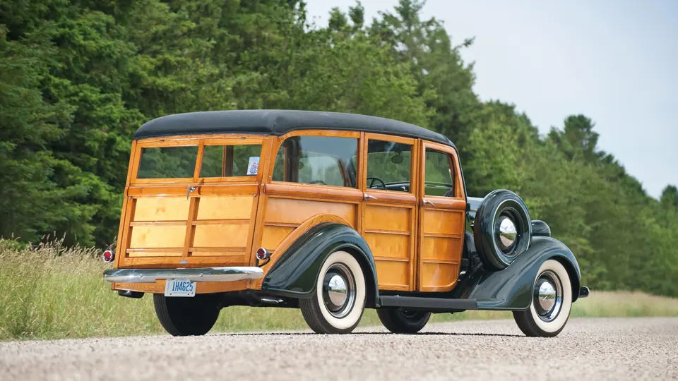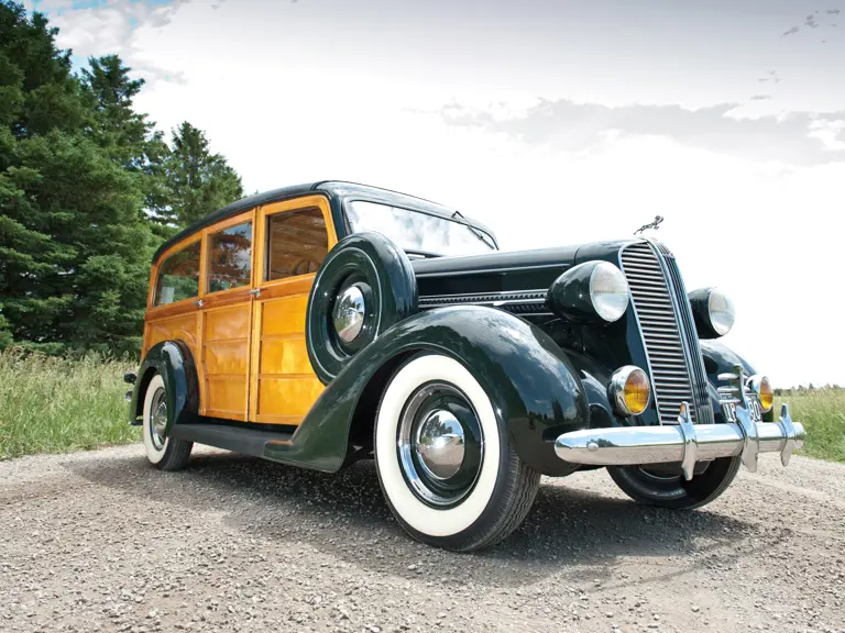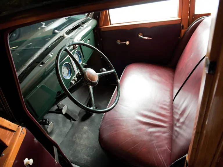 The striking 1937 Dodge Westchester Suburban Woodie Wagon offered here was part of a large collection when it was completely restored in 1993 by Woodie World in Florida. Although it was a very solid, original example to begin with, the kiln-dried, white ash framing and maple paneling were replaced where necessary, as was the tongue-and-groove woodwork. The three seats of the seven-passenger wagon were completely restored and recovered in striking burgundy leather, which wonderfully complements the dark Brewster Green paint and beautifully finished light wood body and panels.