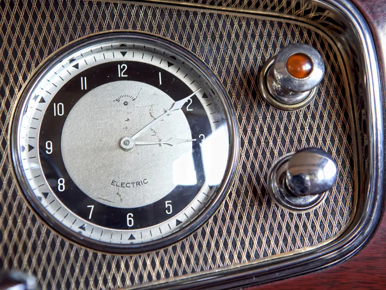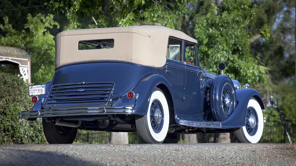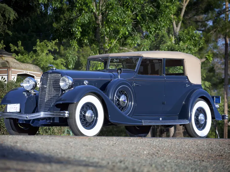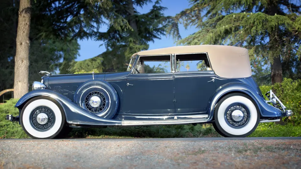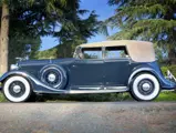 Among the most attractive “semi-customs” of 1934 was style number 281, a convertible sedan designed by Raymond Dietrich and built by his imprint of Briggs Manufacturing. A distinctive vee’d windshield and convertible top offered open motoring with a speedboat-like flair, and, even with the top raised, a surprising amount of headroom was available, making a comfortable enclosed limousine for all-weather use.