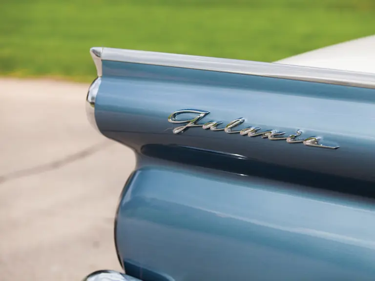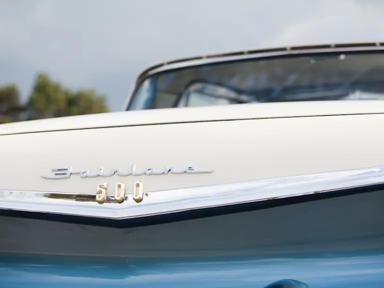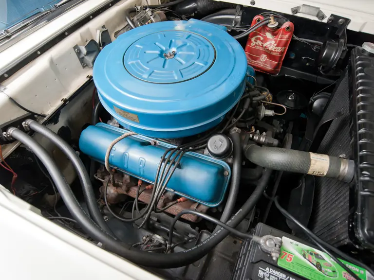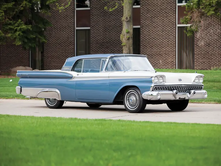 The Skyliner offered here was built in May 1959, at Ford’s hometown factory at Dearborn, and it is equipped with a correct 200-horsepower, 292-cubic inch V-8 and three-speed Cruise-O-Matic transmission. As a recipient of an older cosmetic restoration in Wedgewood Blue and Colonial White with matching vinyl and cloth upholstery, it is very well-equipped, with power steering, AM radio, power antenna, stainless steel fender skirts, accessory wire wheel covers, and modern radial tires. With a thorough detailing, this Skyliner would present nicely at local shows and cruises. Carefully stored and cared for within the Kughn Collection, it is certain to draw a crowd wherever it is driven and shown. Even with retractable hardtops now a fixture in the convertible market, this American original is no less dazzling, demonstrating “the car of the future” as only our own engineers of the 1950s could build it.