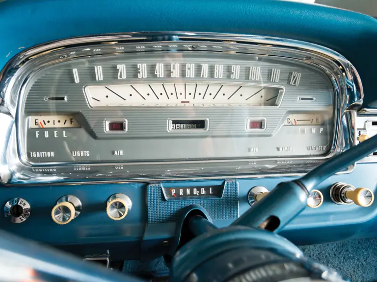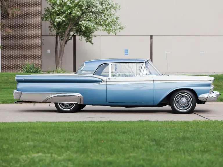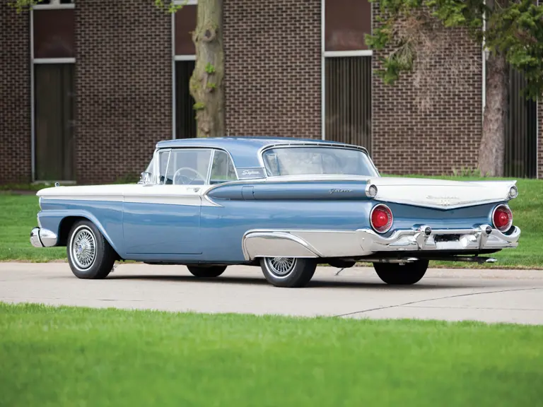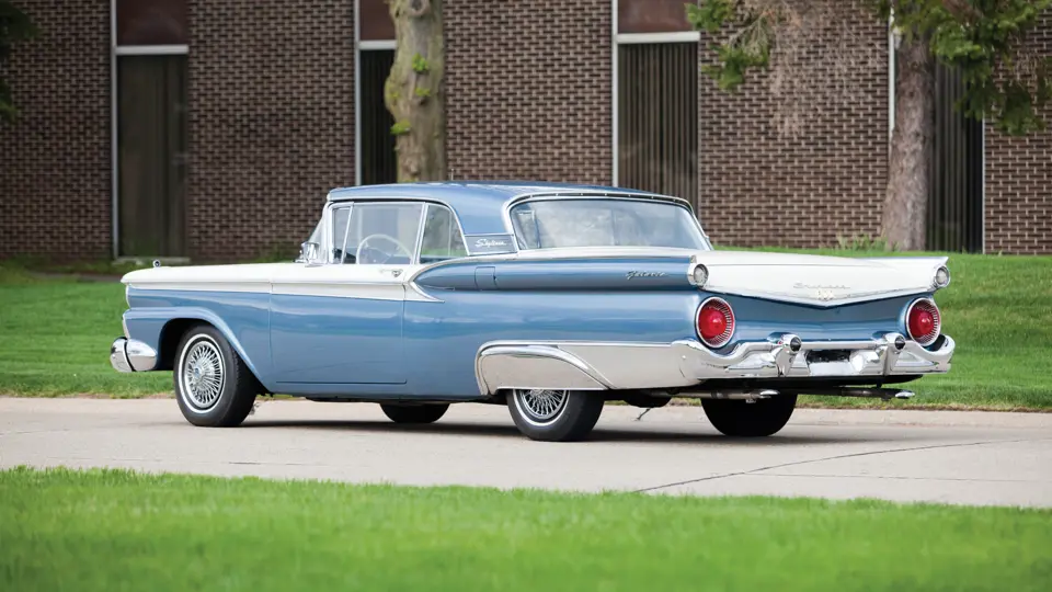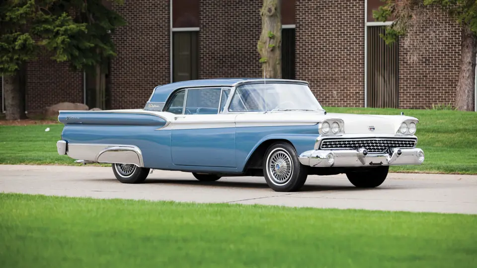The Skyliner lasted three years in production, with its final year being 1959, when it sold 12,915 units despite a $400 premium over the conventional Sunliner ragtop, making it, at $3,346, the most expensive full-size Ford. Part of the Fairlane 500 series at the beginning of the model year, it was made a Galaxie—a simple matter of new script—halfway through the year, and it helped Ford to all but tie rival Chevrolet for number one in industry sales. The new-for-1959 styling, an award winner at French style shows, and a beautiful build quality didn’t hurt matters.