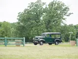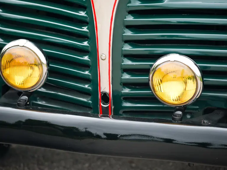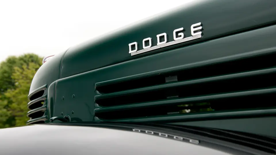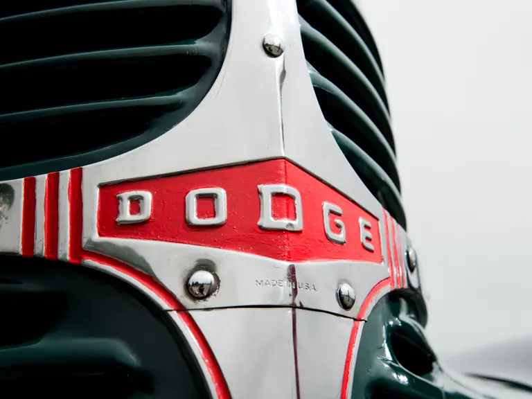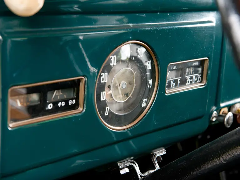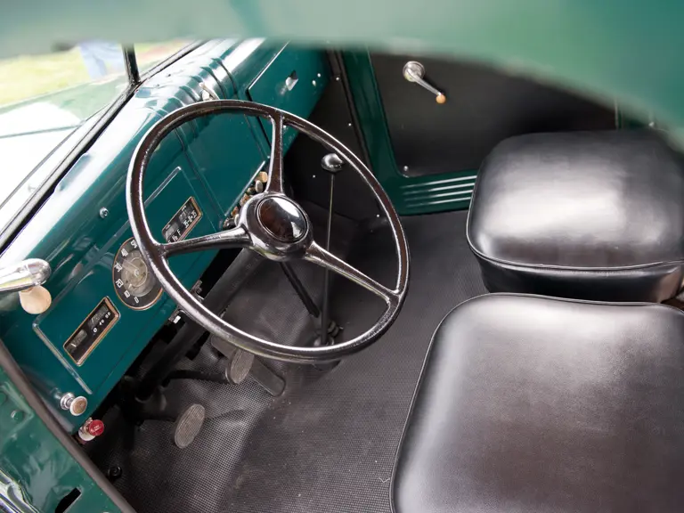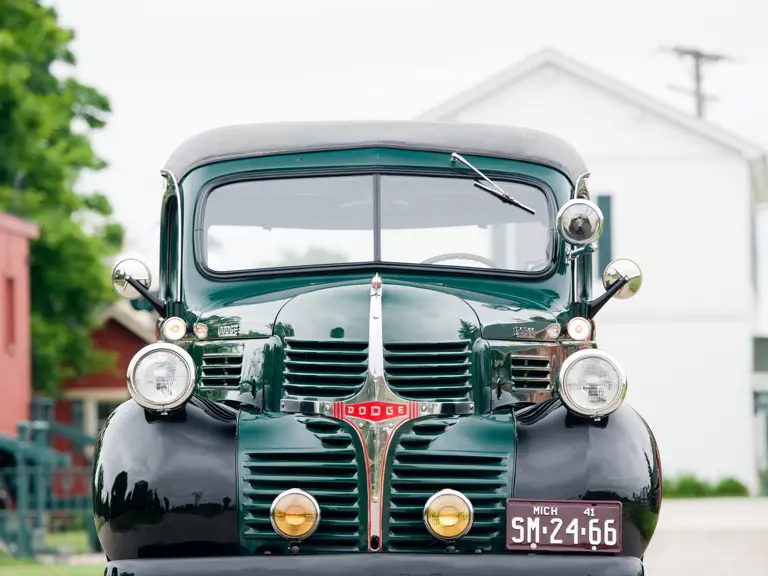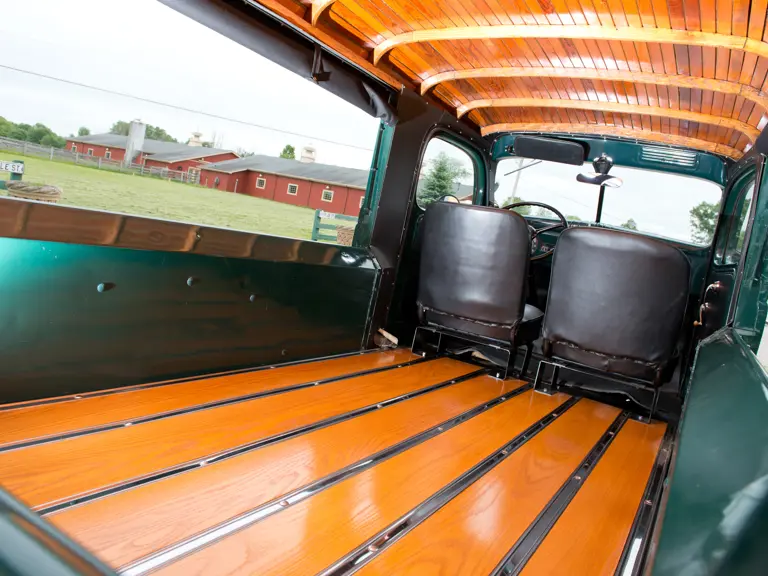 This 1941 Dodge Canopy Express Truck is one of a few produced prior to the entry of the United States into World War II. Even before Pearl Harbor, the nation was gearing up for hostilities, and the industrial base was moving away from automobiles. It has been freshened within the last two years; the green and black paint have been touched up where necessary, and new wood has been fitted to the truck bed, along with stainless steel strips. The engine compartment has been completely detailed, with the engine painted in correct silver and the ancillaries in gloss black. It is tastefully accessorized with fog lights, a windshield post spotlight on the driver’s side, and bright trim rings on the wheels. Unusually, it has a front passenger seat, which was usually omitted on basic models to allow the driver direct access to the cargo area. The roof is fabric covered, with supporting wood slats elegantly varnished underneath.