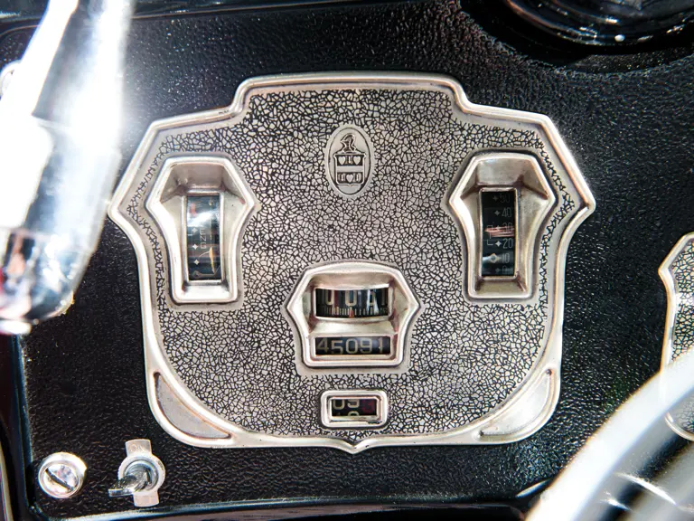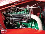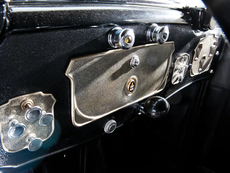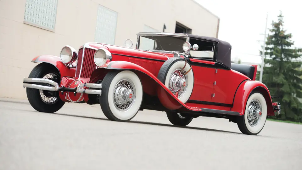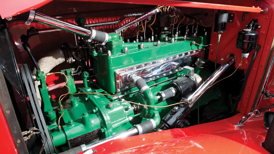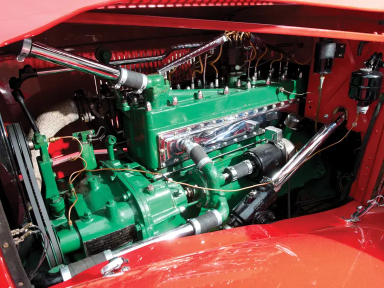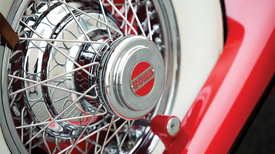 The Cord’s front-wheel drive system, inspired by Harry Miller’s Indy Cars and developed by Cornelius van Ranst, employed a Lycoming straight-eight that was reversed in the chassis so that the transmission was at the extreme front. For simplicity, the drum brakes were mounted to the inboard ends of the drive axles and a long shifter rod traveled up and over the engine, passing through the firewall and into the dashboard. Moving the transmission to the front of the car offered numerous advantages, most notably improving handling and tractability. The lack of a driveshaft tunnel allowed for bodies to be mounted low on the frame, with the result being that the Cord was no taller than a person of average height. Interiors boasted flat floors, allowing for comfortable, spacious seating, even in the two-passenger cabriolet, which, driven by Wade Morton, served as the pace car for the 1930 Indianapolis 500.