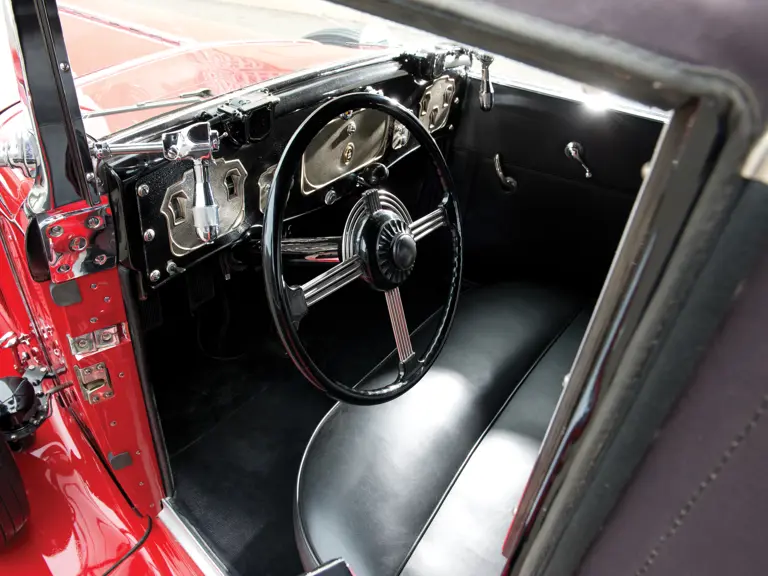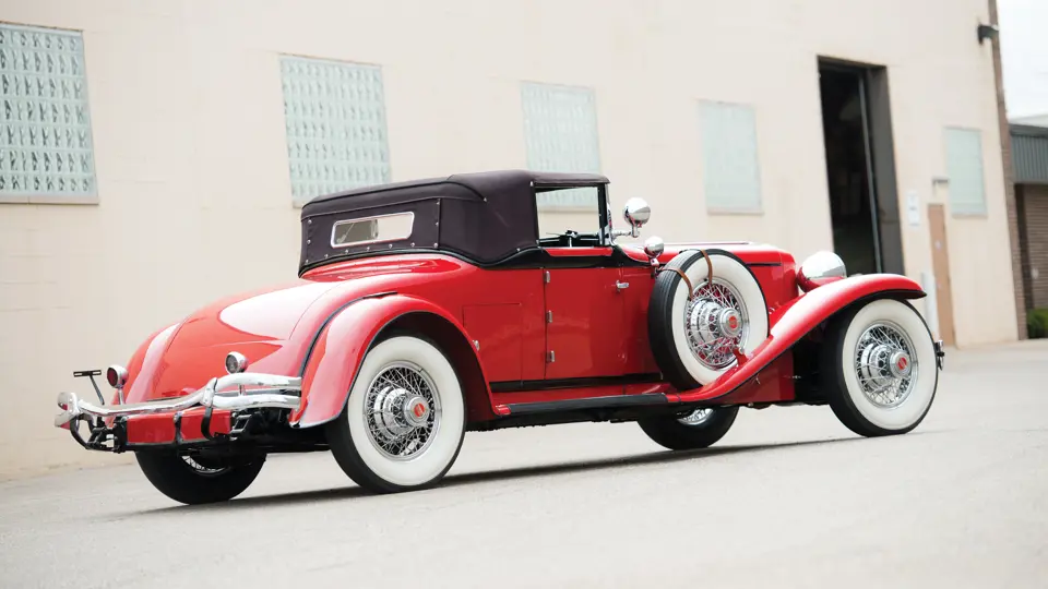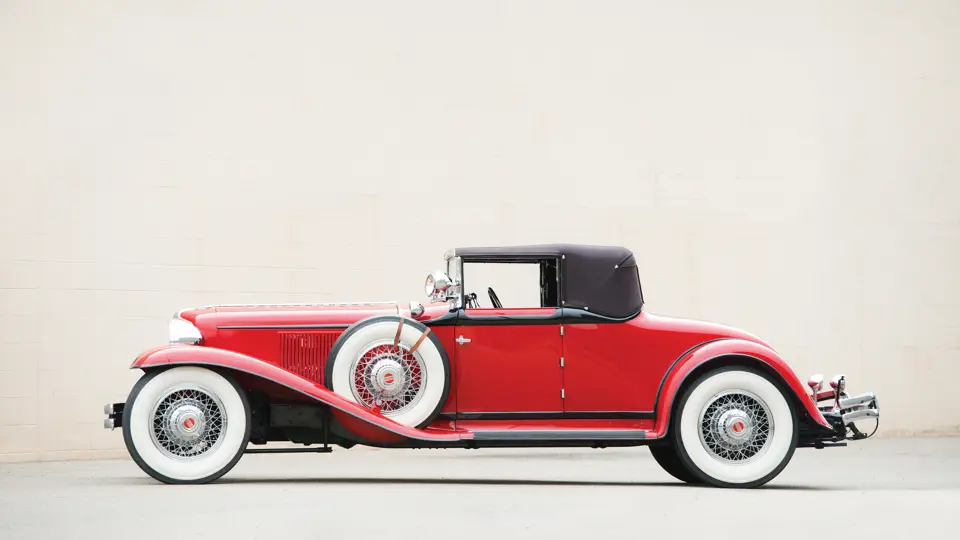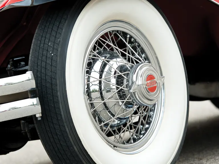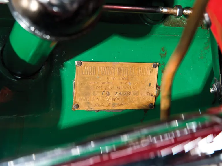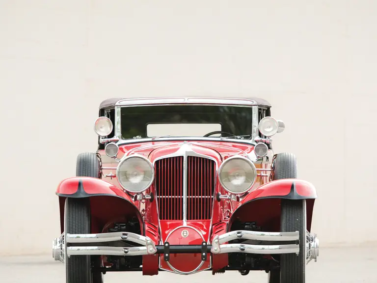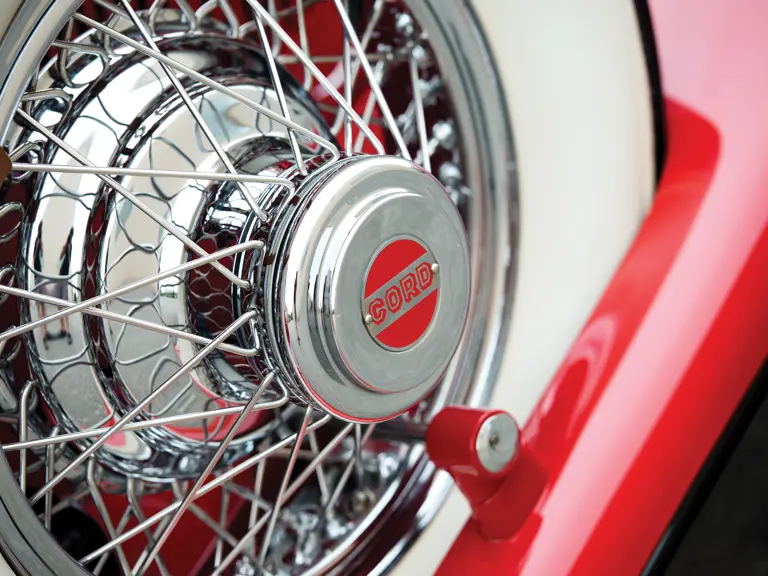 The Cabriolet offered here was built in July 1930, and it was a late 1930 model that remained unsold as the industry entered 1931; accordingly, the chassis was renumbered by the factory from 2928480 to the present 2929040, explaining the presence of both numbers on the chassis. The car’s history since includes long-term ownership by Louisiana enthusiasts Tom Landers and Bobbie Crump, prior to joining the present owner’s collection, which includes some of the finest Auburn Automobile Company products in existence. The Cord was restored in the late 1990s, and it was issued Auburn Cord Duesenberg Club certification number CL-077, certifying it as a Category One car—an important blessing of originality and authenticity of all major components, as bestowed by those who know these cars best. Showing well in its red and black, with a black leather interior and black canvas top, it is equipped with dual side-mounted spares, chrome wire wheels, driving lights, and dual cowl lights, and it would continue to present well for show with minor freshening; recent work has included the installation of correct cowl light and headlamp lenses and correct interior door handles. In addition, this would be an outstanding touring car suitable for ACD Club events and CCCA CARavans, in which many L-29s have covered thousands of enjoyable miles.