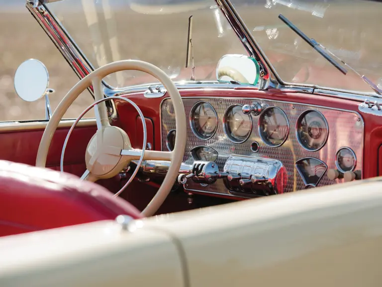 The car’s history has been traced back as early as 1955, when an original registration, included in the file, places it in the care of Mrs. Samuel T. Pruit, of Honolulu, Hawaii. It has since enjoyed many years of ownership by Midwestern enthusiasts, including well-known Cord guru J.K. Howell. Henry Noffke acquired the car around 1980 and spent the next decade restoring it to original condition.