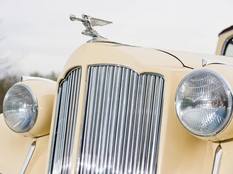 The current owner acquired this stunning Series 1605 Convertible Sedan in the early 2000s. He completed its restoration, doing most of the work himself, in 2005. During this time, he performed a full body-off restoration and left no screw unturned. The light yellow color is Packard’s Ivory White, and the interior is finished in maroon leather. The maroon accent elegantly repeats in the pinstriping and windlace on the black canvas top. Furthermore, it features a fully restored banjo-style steering wheel, restored instruments, and a working radio.