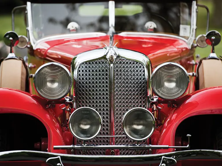 The car offered here, serial number 7801805, was restored in the 1980s with a well-crafted dual-cowl phaeton body in the style of a LeBaron original and carrying a reproduction body tag of 147-32. The front fenders are original, but it appears that the rear fenders were reproduced or modified as needed to fit the new coachwork. The restoration has held up well over the years and continues to show good panel fit throughout, with fine red paint showing few signs of use. The older brown leather interior, tan canvas top, and reproduction dashboard gauges show some signs of driving enjoyment. Period chrome wire wheels are fitted, along with dual side-mounts with cloth covers and mirrors, dual trumpet horns, tail lamps, wind wings, a radiator stone guard, a rear luggage track, a trunk, and the classic Gazelle radiator mascot.