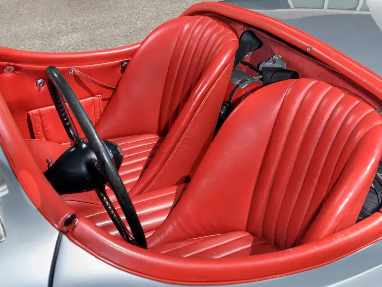 The interior was retrimmed, and now features red upholstery and red carpets. The seats are upholstered to match the interior, but are designed for modern racing and are equipped with safety harnesses. It features Smiths instrumentation and a dash-mounted rear-view mirror. This Jaguar’s engine block is numbers matching, however, the car’s original C-Type cylinder head has been replaced. The current gearbox is a Moss model JL, with model JH internals. It was rebuilt by CKL, in October 2012, at a cost of £4,676.