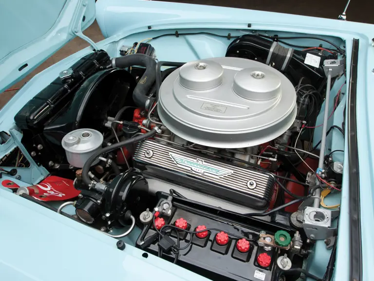 270 bhp, 312 cu. in. V-8 engine with dual four-barrel carburetors, three-speed manual transmission with overdrive, independent front suspension with unequal length A-arms and coil springs, live rear axle with semi-elliptic leaf springs, and four-wheel power-assisted hydraulic drum brakes. Wheelbase: 102 in.