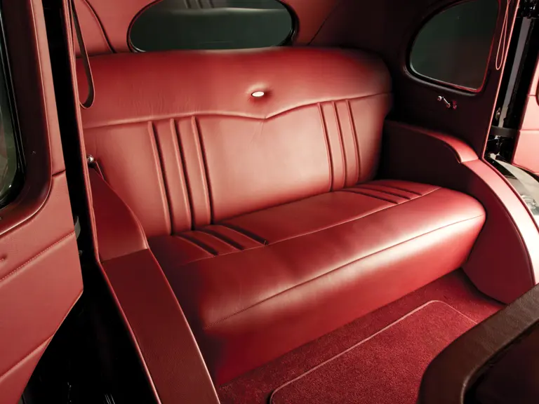 The car was fully disassembled, and the front frame was modified to accommodate an LS3 Corvette engine with a custom camshaft and builder that is estimated at 560 horsepower and mated to a Hydramatic four-speed transmission. Air conditioning was added, along with power steering and power disc brakes, in an effort to reign in some of that power. The four wire wheels are mounted with wide whitewall radial tires, while a restored trunk has been set atop the rear trunk rack for the long road ahead. The gorgeous ebony body is straight and true and adorned with all-new chrome and trim, as well as dual side-mounts and Trippe safety lights.