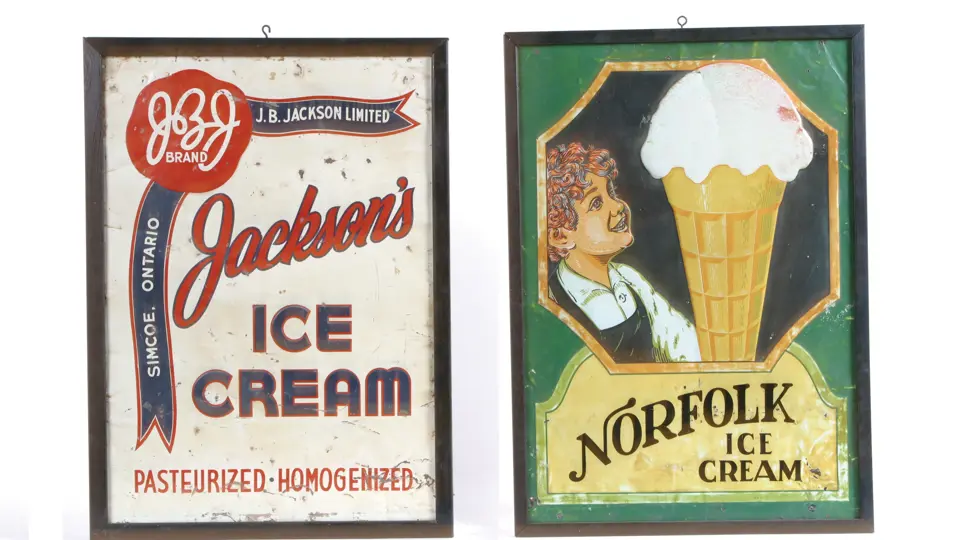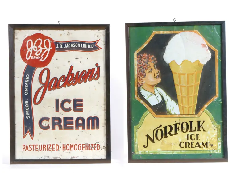 Lot includes an original paper advertisement for Caswell's Pineapple Sundae in a glass and metal frame, 14"x20", an original tin Caswell Ice Cream sign, with raised lettering, 15"x35" Q3, and two original metal Caswell Dairy signs, one for Caswell ice cream, 20"x27" and the other displaying Caswell Dairy products, 36"x24" Q3. Lot also includes two original metal signs in wood frames, one for Norfolk ice cream, and the other for Jackson's ice cream, both 20"x29" Q3