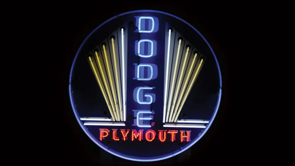 An outstanding Dodge/Plymouth neon sign in excellent, overall condition. Measuring approximately 47 inches in diameter, it is of new construction and in excellent operating order.