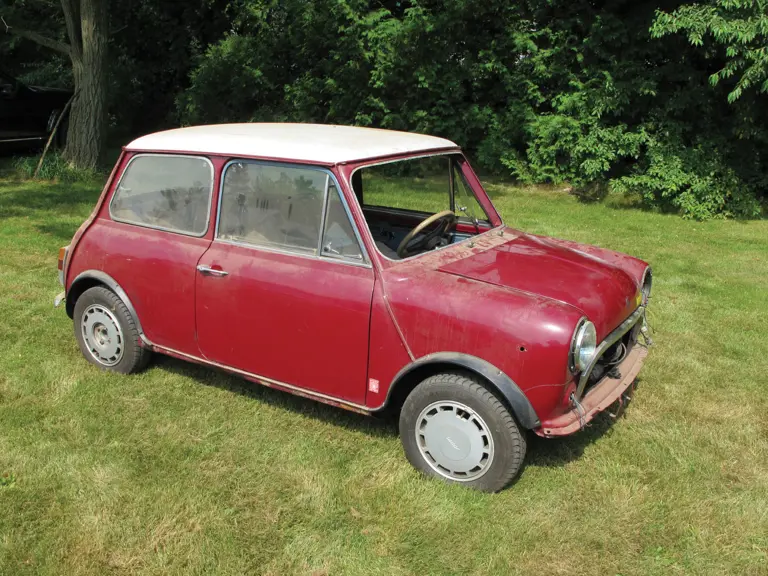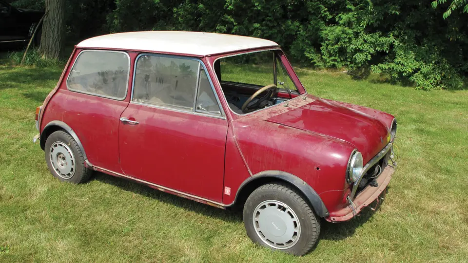 This left-hand drive Mini needs a windshield and further work. It has a rebuilt engine installed.