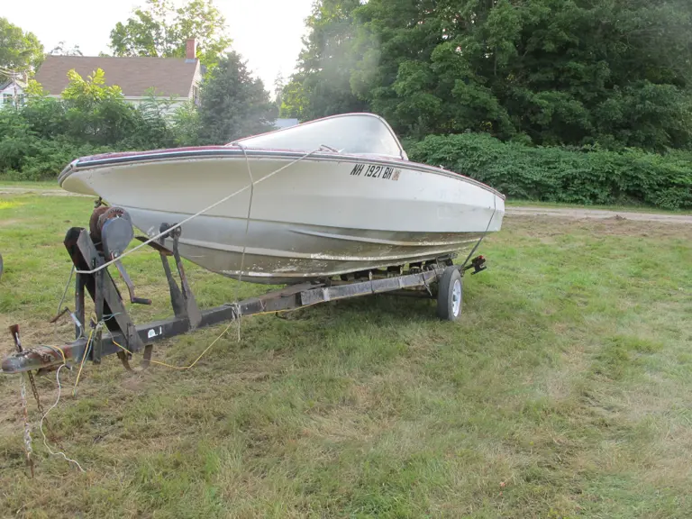 This boat is a 14-foot runabout with an Evinrude outboard motor on the back and a trailer underneath it.