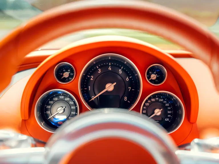 This remarkable one-off Grand Sport now displays 11,624 kilometres at the time of cataloguing and is accompanied by its factory accessory box, famous speed key to achieve the top speed, original Bugatti owner’s manuals, service book, and car cover.