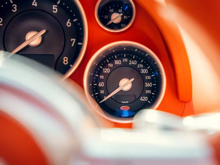 Dieses bemerkenswerte Einzelstück des Grand Sport zeigte zum Zeitpunkt der Drucklegung 11.624 km auf dem Kilometerzähler an. Zum Fahrzeug gehören die Accessoire Box, der berühmte Speedkey zur Erzielung der Höchstgeschwindigkeit und die Bugatti Handbücher, das Serviceheft und eine Autoschutzdecke.