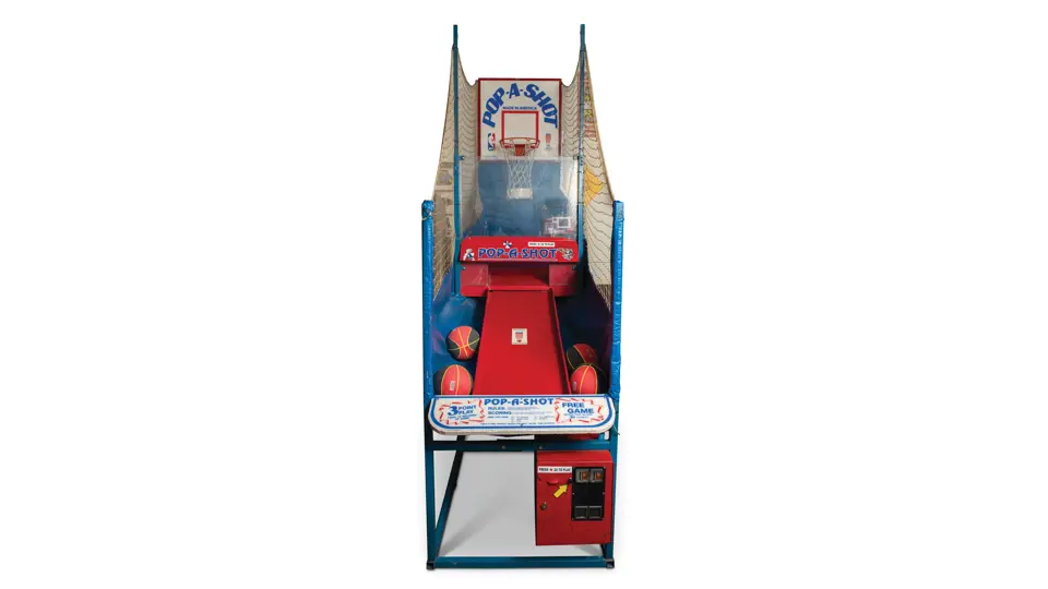 Coin operated basketball game. Includes four basketballs. 50 cents to play.