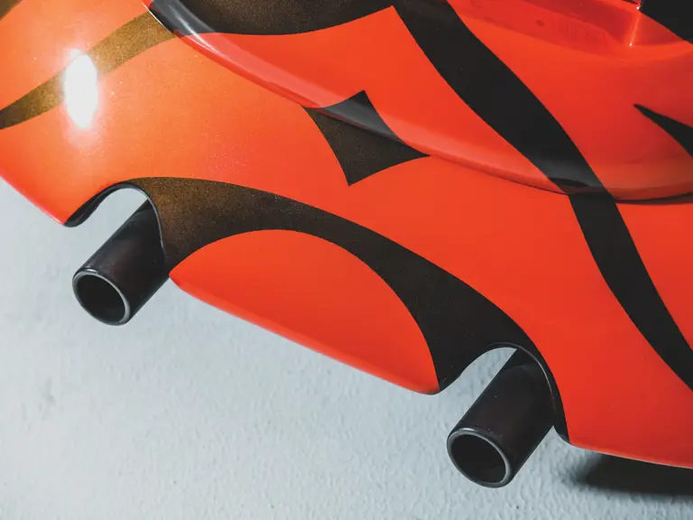 At its base is a standard 1971 Super Beetle with a sunroof. Exterior trim was shaved, and the trunk lid was smoothed out to give the “Jungle Bug” an even cleaner look. Yellow-tinted headlight lenses give the car an animalistic look, reinforced by its custom orange body with black stripes, painted by Carl’s Auto FX in Dayton, Ohio. Modifications are extensive. The running boards were extended to flow with the tweaked fenders, and the bulky factory taillights were discarded in favor of a pair of strips built into the rear fenders. Purple-hued Colorado Custom Ft. Lupton wheels are wrapped in Kumho performance tires.
