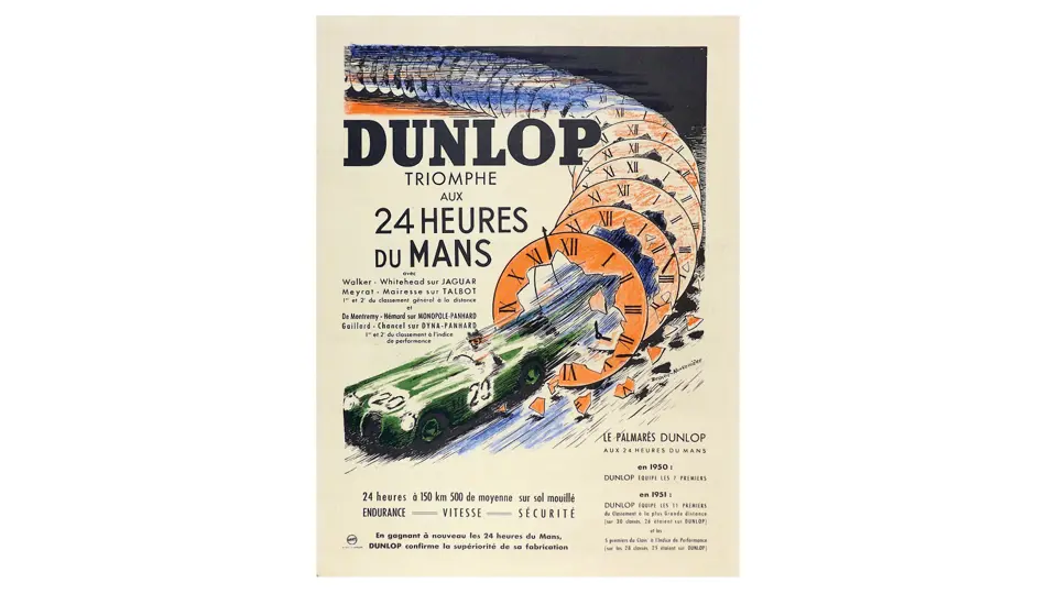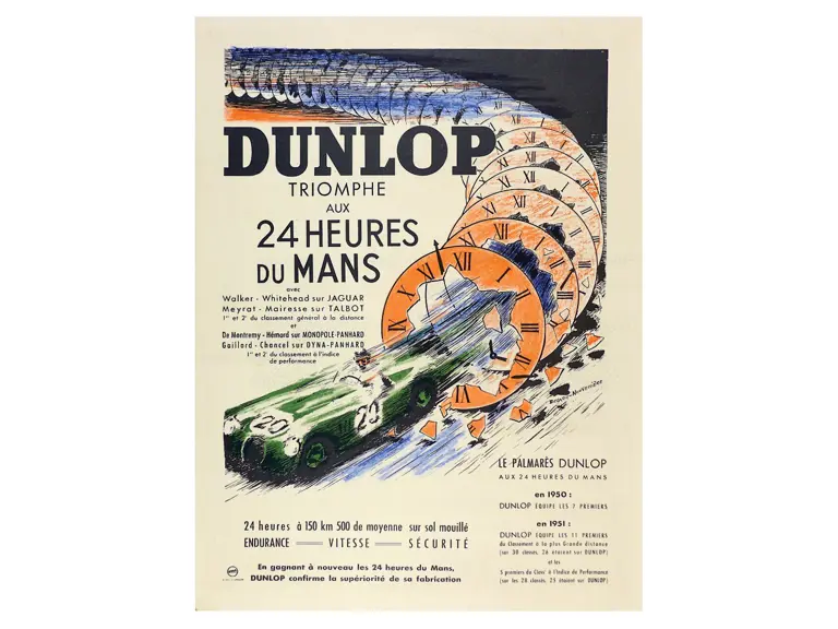 Dunlop Triomphe aux 24 Heures du Mans. Wonderful art by Delarue-Nouvellière with race results, including Jaguar and Talbot.