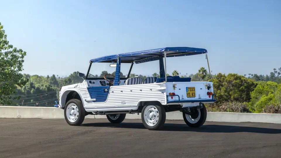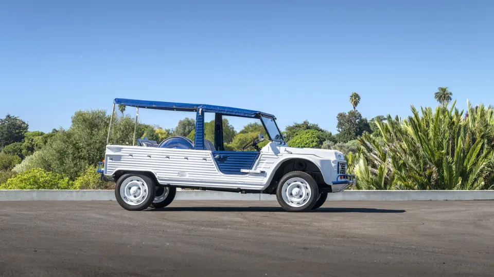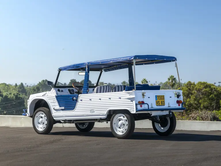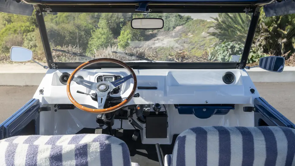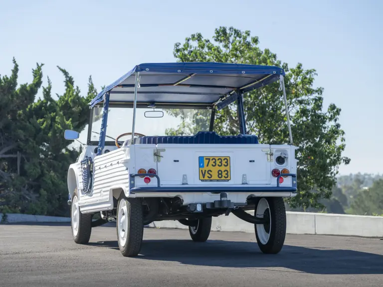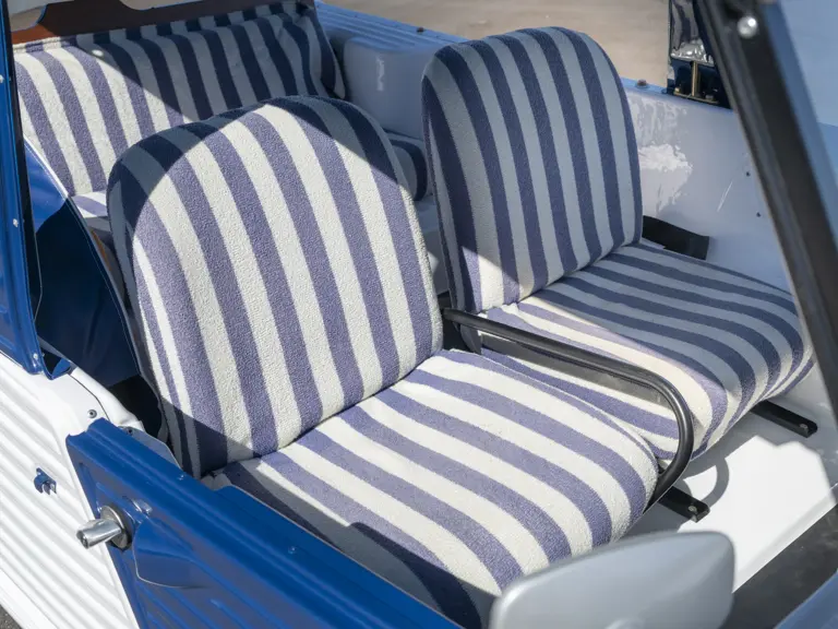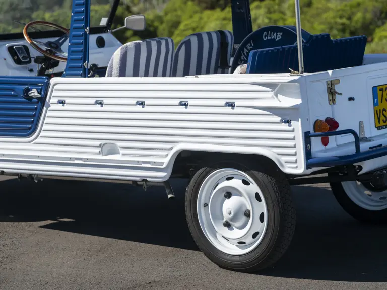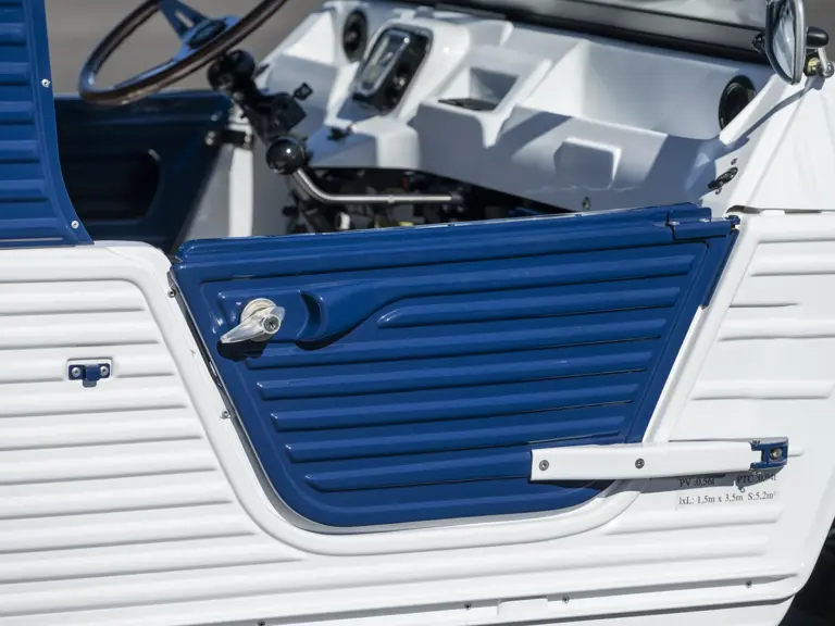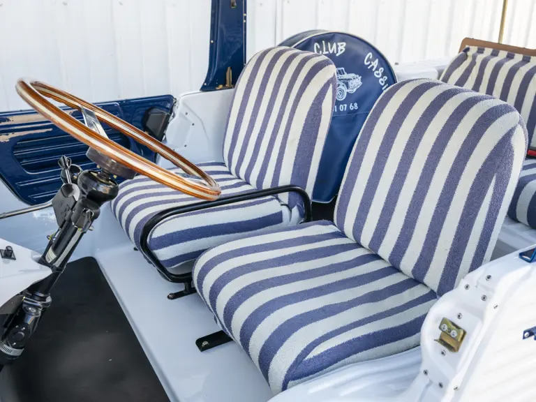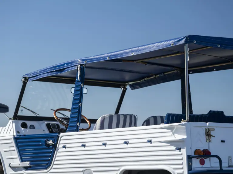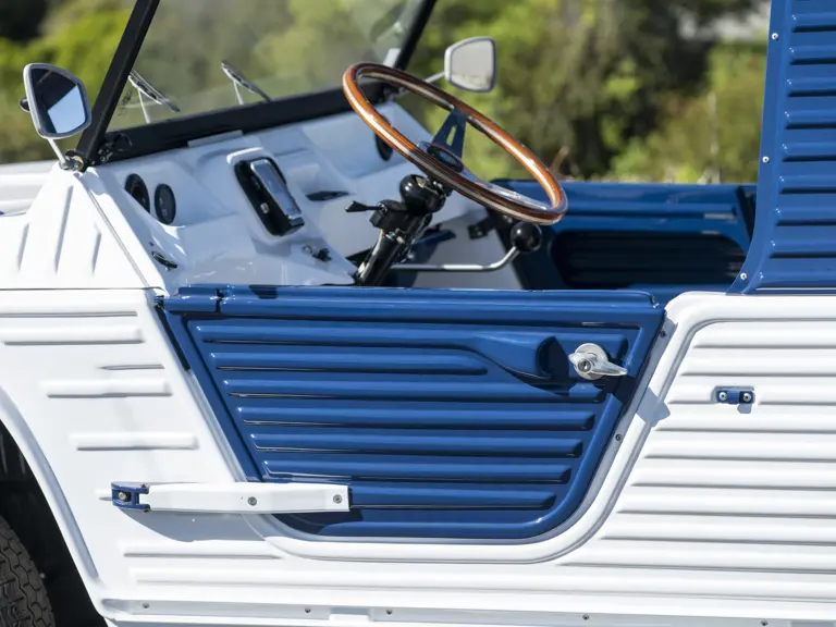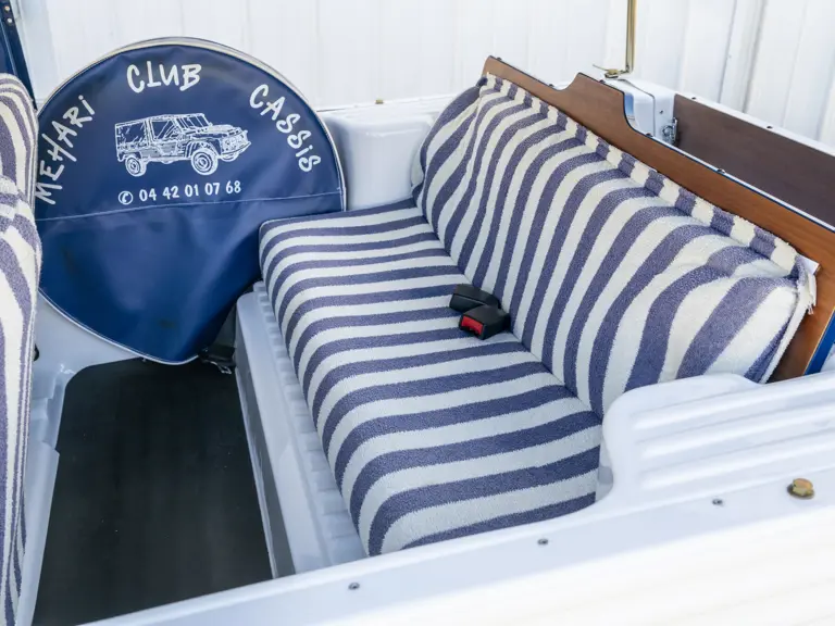 The Méhari on offer is delightful to behold, reportedly restored by the renowned 2CV Méhari Club Cassis, Citroën specialists based on the French Riviera. Finished in Beige Hoggar, named for the sun-baked Hoggar Mountains of Southern Algeria, the car exudes a distinctly Mediterranean charm, while nautical-inspired details, including striped terrycloth fabric upholstery and warm wood paneling, reflect its playful spirit.