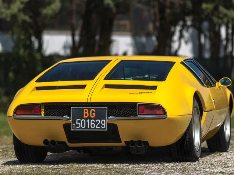 The first true production De Tomaso was the Mangusta, which was introduced in 1967. It was designed by Giorgetto Giugiaro and built by fabled Turin coachbuilder Ghia, of which de Tomaso had become the president. The car was reportedly based on the Ford GT40 concept, as it featured a mid-ship V-8 engine, rear transaxle, and backbone chassis. Giugiaro’s muscular, wide-shouldered bodywork emphasised that the engine, which was visible under two clamshell-style rear windows, could propel the car from 0 to 60 mph in 6.3 seconds, through the quarter-mile in 15 seconds at 94 mph, and to a claimed top speed of 155 mph.