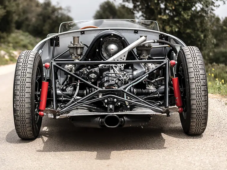 The 550A Spyder was Porsche’s first purpose-built competition model, introducing a new lightweight spaceframe chassis, fully independent suspension, a five-speed gearbox, and revised coachwork. The 550A differed from its predecessor in a number of particulars. Most notably, the ladder-type frame was replaced by a steel-tube spaceframe which was both stiffer and lighter, with a weight savings of 16 kg (35.3 lbs.). The weight of the complete body was reduced by no less than 27 kg, care to the fact that the new frame provided higher mounting points that allowed for many of the body reinforcements to be eliminated. Torsional stiffness of the frame was tripled, and the overall stiffness was five times that of the previous type ladder frame. Overall, the 550A hardly weighed 530 kg (1,168 lbs.), excluding fuel, but including the compulsory spare wheel.