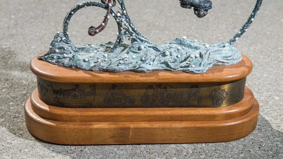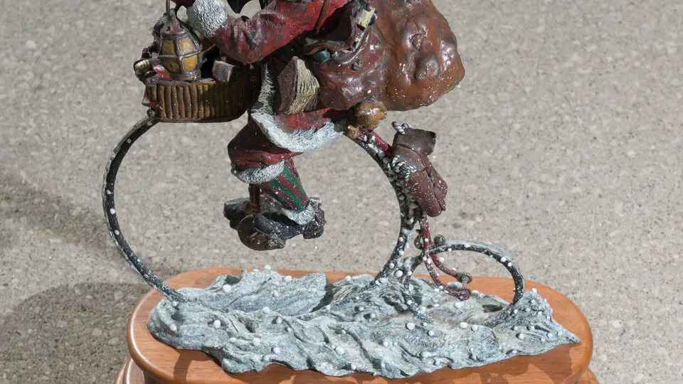 This hand-painted bronze sculpture attractively illustrates Wanlass’ love of Christmas and the delights awaiting the children in his life. “Silent Knight” depicts a grinning Santa riding through the snow on an early high-wheeler bicycle while delivering his sack of toys to all the good girls and boys. It is beautifully executed and displays wonderful detail throughout.
