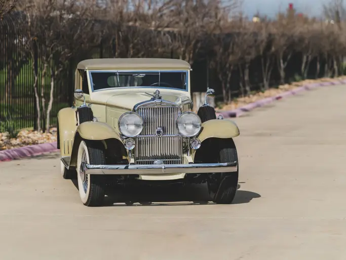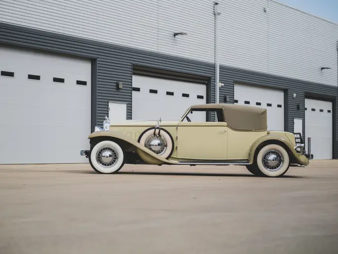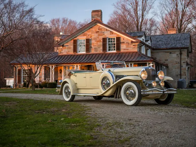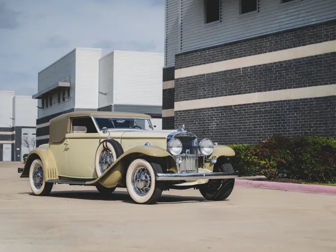 1931 Duesenberg Model J Tourster by Derham - One of just eight original examples of the coveted coachwork style and retains its original chassis, firewall, engine, and body. Chassis 2464 is further distinguished by its unique factory-designed hood with 18 vertical louvers and a well-documented provenance including ownership by Dr. Irwin Ginsberg, Andy Granatelli, and MArgie and Joseph Cassini III. Comprehensively restored by RM Auto Restoration, with much of its original structure preserved, the car is presented in soft yellow over green leather and has been a highly successful concours entrant, earning Best in Class honors at the Pebble Beach Concours d’Elegance. ACD Club Certified Category 1 and ideally suited for touring, it represents one of the finest surviving Derham Toursters (Estimate: $2,250,000–$3,250,000 USD).
