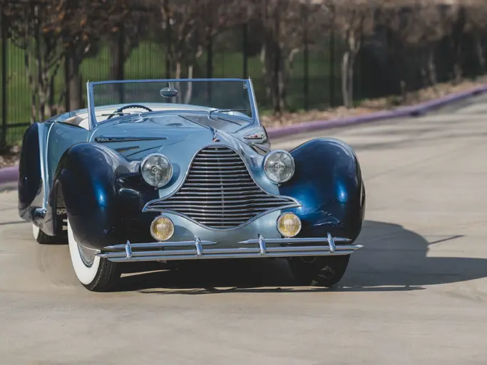 1947 Talbot-Lago T26 Record Cabriolet by Figoni et Falaschi - A striking example of post-war French coachbuilding, chassis 100109 features flamboyant Figoni et Falaschi coachwork defined by sweeping “aviation-type” fenders, Art Deco detailing, and elegant two-tone finishes. Originally ordered by Louis Ritter and later owned by director George Sidney, it was comprehensively restored by RM Auto Restoration, including the rebuild and refitting of its original T26 engine, and refinished in metallic sky blue over midnight blue with a cream leather interior. A highly decorated concours entrant, it has earned class honors at the Pebble Beach Concours d’Elegance, Best Postwar European Car at the Amelia Island Concours, and multiple Best of Show awards in recent ownership. Offered from The Ray and Bonnie Kinney Collection, it represents one of the most visually compelling and significant Talbot-Lago cabriolets of the era (Estimate: $1,900,000–$2,500,000 USD).