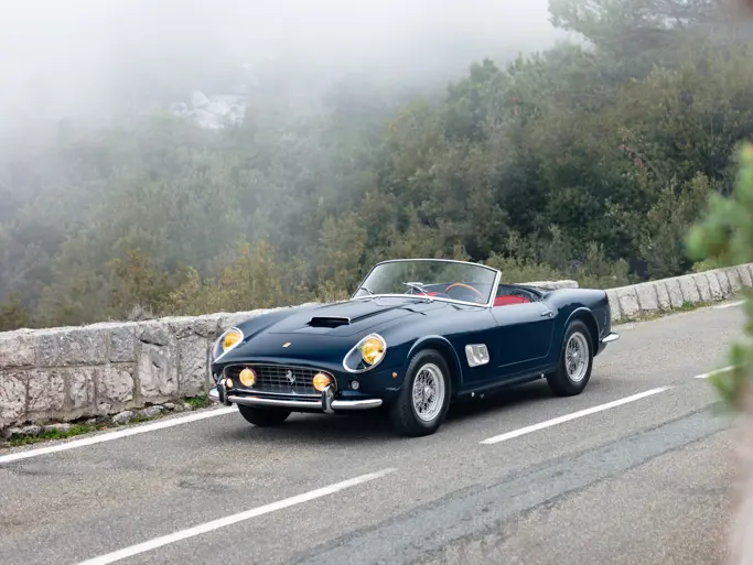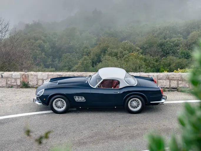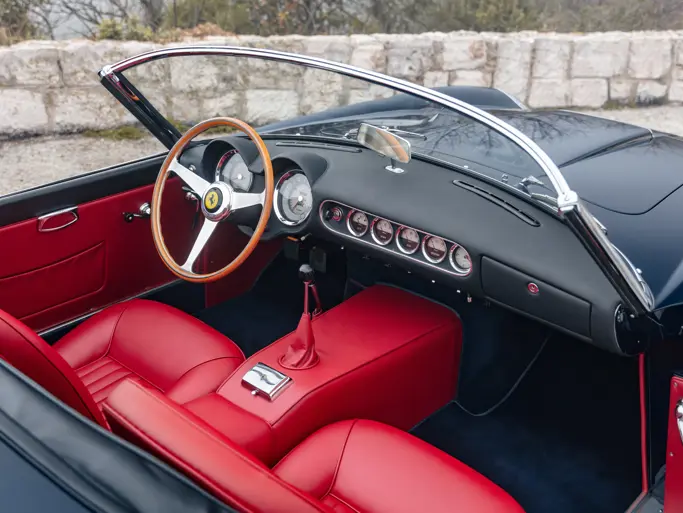 In 1965 the Ferrari was exported to Luigi Chinetti Motors in the United States, where it remained for the next 35 years. It stayed in the hands of a single owner for three decades, during which the car was repainted in red. In 2000 the Spider was imported to the UK and in 2018, 2955 GT was submitted for certification by Ferrari Classiche, and it was later issued a Red Book that notes the presence of the matching-numbers engine, gearbox, rear axle, and coachwork. The Ferrari was then sold in 2019 to the consigning owner who commissioned a second restoration, this time by Dino Cognolato’s highly respected shop in Vigonza, Italy. In addition to a complete mechanical overhaul, the Spider was treated to a refinish in the current elegant colour of Blu Scuro over a red interior, with the addition of a silver hardtop. Following the completion of the restoration in 2022, the Ferrari was exhibited at the 2022 Pebble Beach Concours d’Elegance—a strong endorsement of the car’s overall importance and quality.