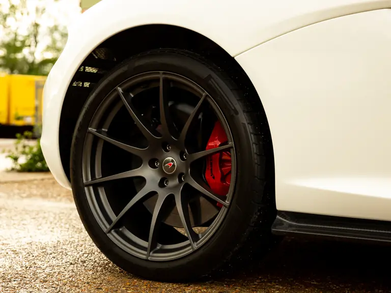 Finished in Pearl White with a red stripe on the nose, this car was specified with numerous carbon fibre components, including a roof snorkel, door mirrors and mirror arms, front and rear bumpers, side panels and side exit ducts, rear spoiler, rear clam insert, and front splitter. To match the red stripe, the Rocket Red badge set was specified, alongside red-painted brake calipers and the super lightweight wheels in stealth finish. Inside, the interior features a mix of Harissa Red leather and Carbon Black Alcantara, along with seat backs in bare carbon fibre. Further options include the Meridian surround-sound system and front and rear parking sensors.