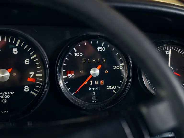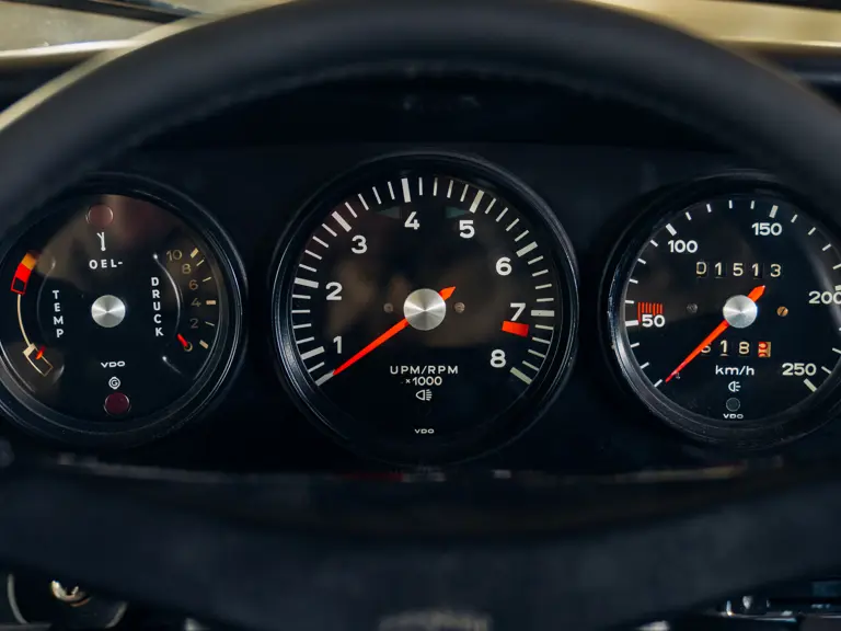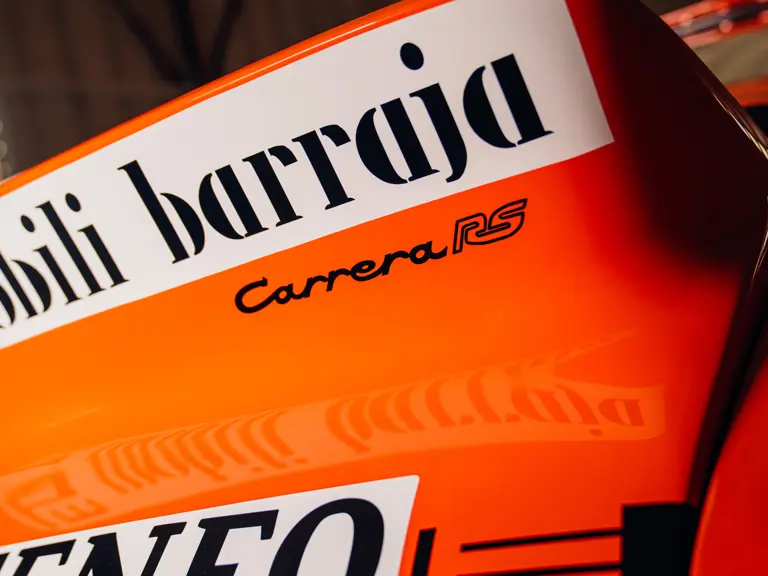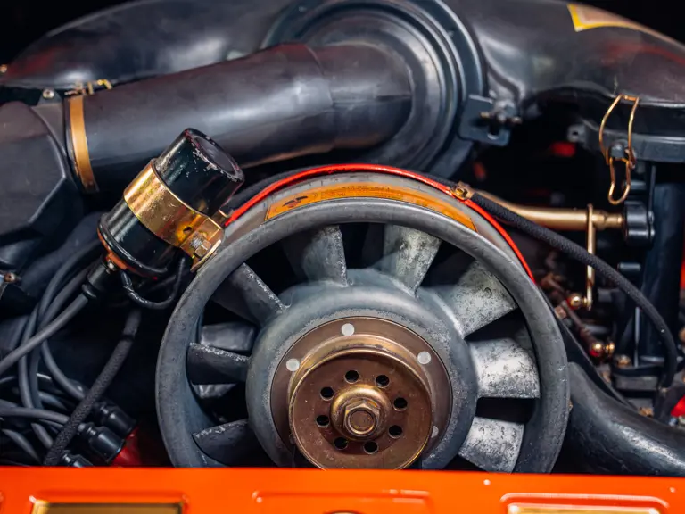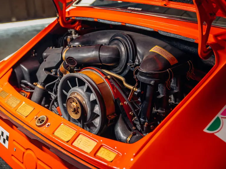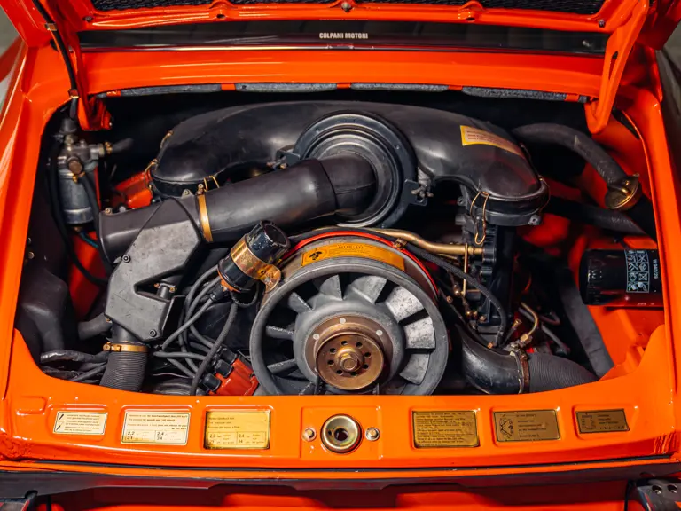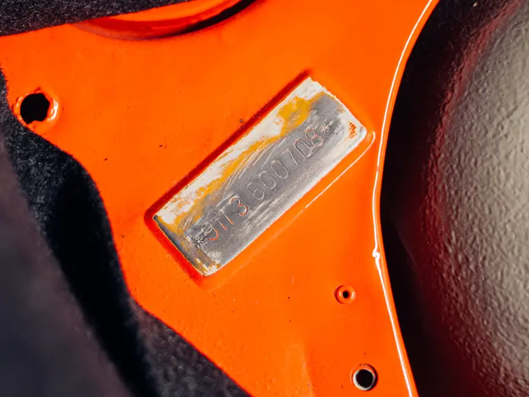 A recent inspection by Andy Prill of Prill Porsche Classics commissioned by RM Sotheby’s determined that the car is indeed a genuine Carrera RS 2.7, with both the chassis number stamping and production number being authentic and matching Porsche’s build records. Evidence of numerous repairs are present, in keeping with its conversion back from RS 3.0 specifications and race history. It is also important to note that the crankcase is a correct replacement, likely sourced from Porsche in period. The full report is available for inspection in the car’s history file.