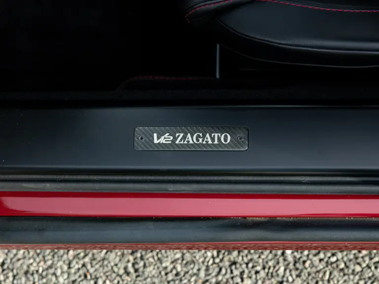 Delivered new to Malaysia via Aston Martin Kuala Lumpur, this is one of just eighteen V12 Zagatos built to RHD specification from a total production run of only 61 road cars. Finished in Diavolo Red, a colour specifically developed for the V12 Zagato, over an Obsidian Black leather interior with contrasting Red stitching throughout to match the paintwork. Furthermore, the car is fitted with the optional Bang & Oulfsen stereo. The specification excludes a certain sporting sophistication, from the Zagato-specific 19-inch black diamond turned wheels to the carbon fibre a-pillars, mirror caps, rear spoiler, and taillight housings.