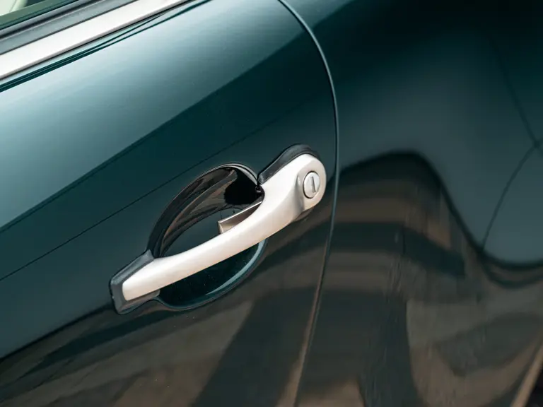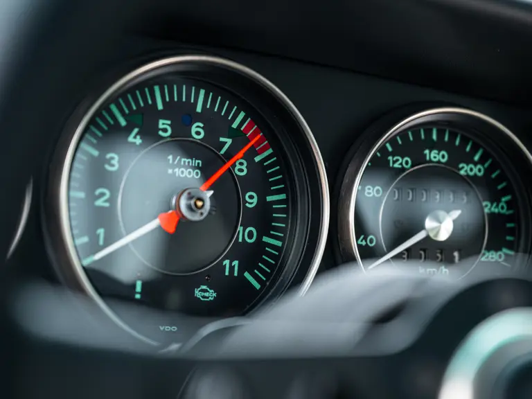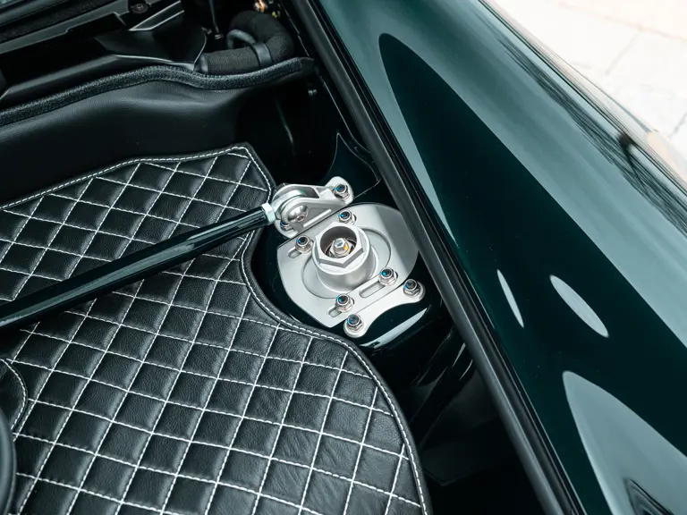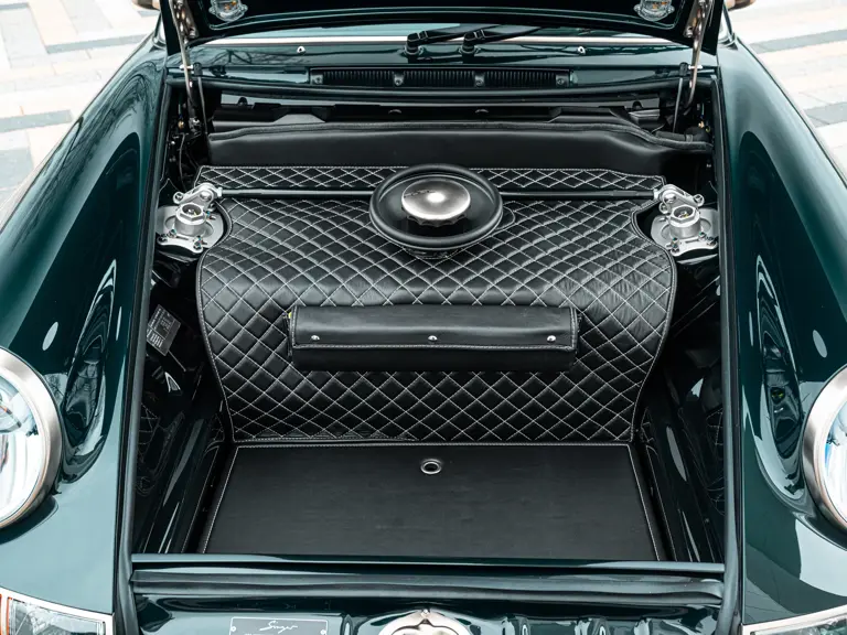 In addition to the aforementioned tachometer, a variety of non-standard, ‘special wish’ options were selected for the Acel commission, most notably a second set of Fuchs-style wheels and tyres, as well as an additional Momo Prototipo steering wheel. These are one-piece wheels with body-coloured centres and shod in Michelin Pilot Sport 4S tyres. In an effort to adequately protect the most touch-sensitive areas of the cabin, the dash strip, emergency brake handle, and door pulls have all be upholstered in black leather. Adding to the car’s practicality, the rear seats are fully deleted and replaced with special cubbies to offer some additional storage.