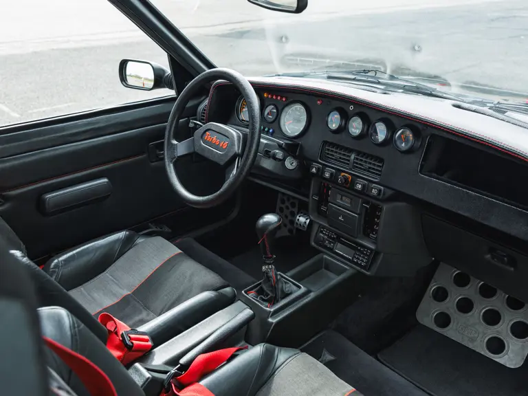 Peugeot took advantage of the technical freedom and comparatively modest homologation requirements of Group B to produce 200 road-legal 205 Turbo 16s. Bearing only a passing resemblance to the production 205, the Turbo 16 was a masterpiece of packaging; its rear-mounted, 1.8-liter turbocharged engine operating in conjunction with a complex viscous-coupled four-wheel drive system beneath a hinged, racing-style rear clamshell. At approximately 200 horsepower, the Turbo 16’s output was barely half that of its competition counterpart, yet 60 mph was still achieved in under seven seconds en route to a top speed of 132 mph.
